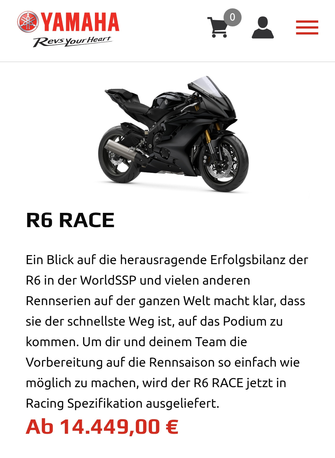 Für 14500€ inkl. Überführung bekommt man die R6 Race Version.