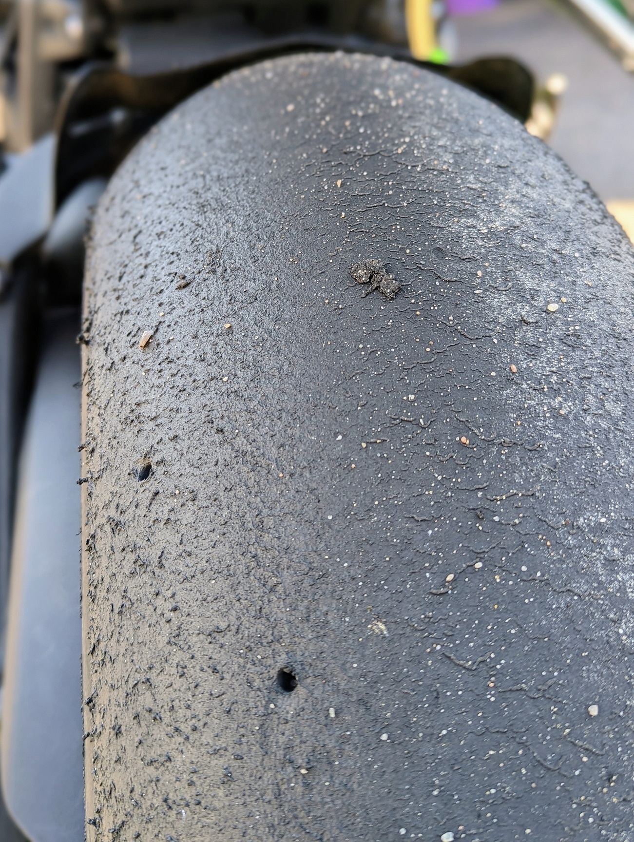 So sieht es nach dem letzten Fahrtag in Walldorf aus. Am Samstag war es in Walldorf mit 20°C schön warm. Die Reifen hatten nach dem Turn hinten und vorne 45°C (Infrarotthermometer). Der Druck war warm VA 2,0 bar und HA 2,3 bar. Ich fahre ohne Reifenwärmer. Es zeigt sich dabei folgendes Reifenbild. Ich finde es sieht eigentlich recht gut aus. Aber es bildet sich eine ca. 2mm hohe Stufe an der äußersten Profilfurche. Ist das normal?