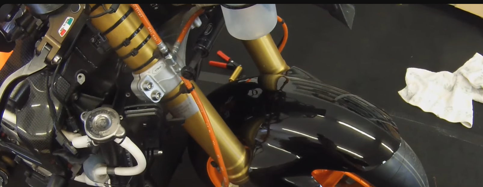Die Leitung geht von der Bremspumpe bis zur unteren Gabelbrücke, wo sie sich über das T-Stück teilt.
