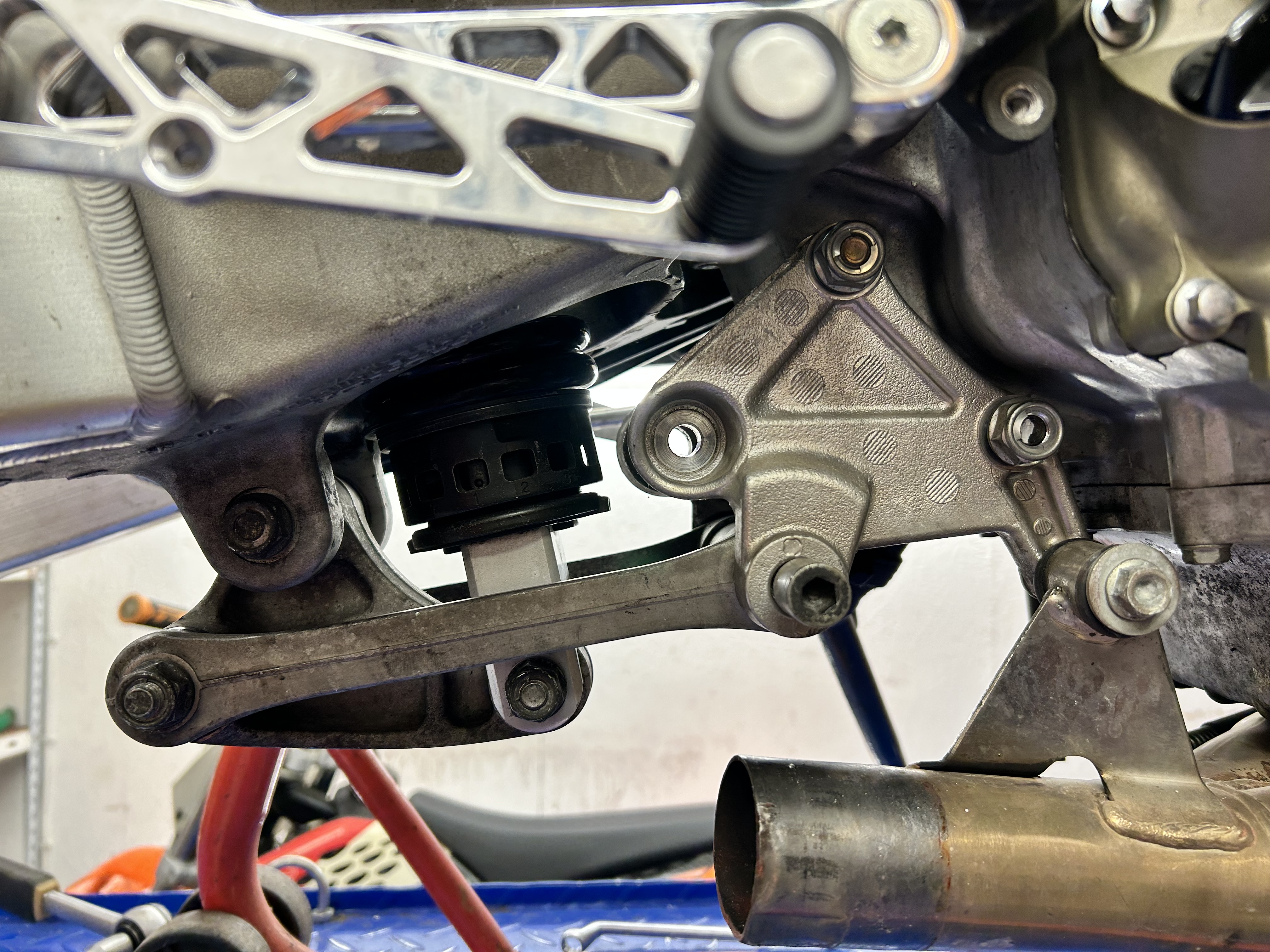 Allerdings gibt es Problem mit der Umlenkung der Schwinge und deren Montagepunkt am Motorrad.
