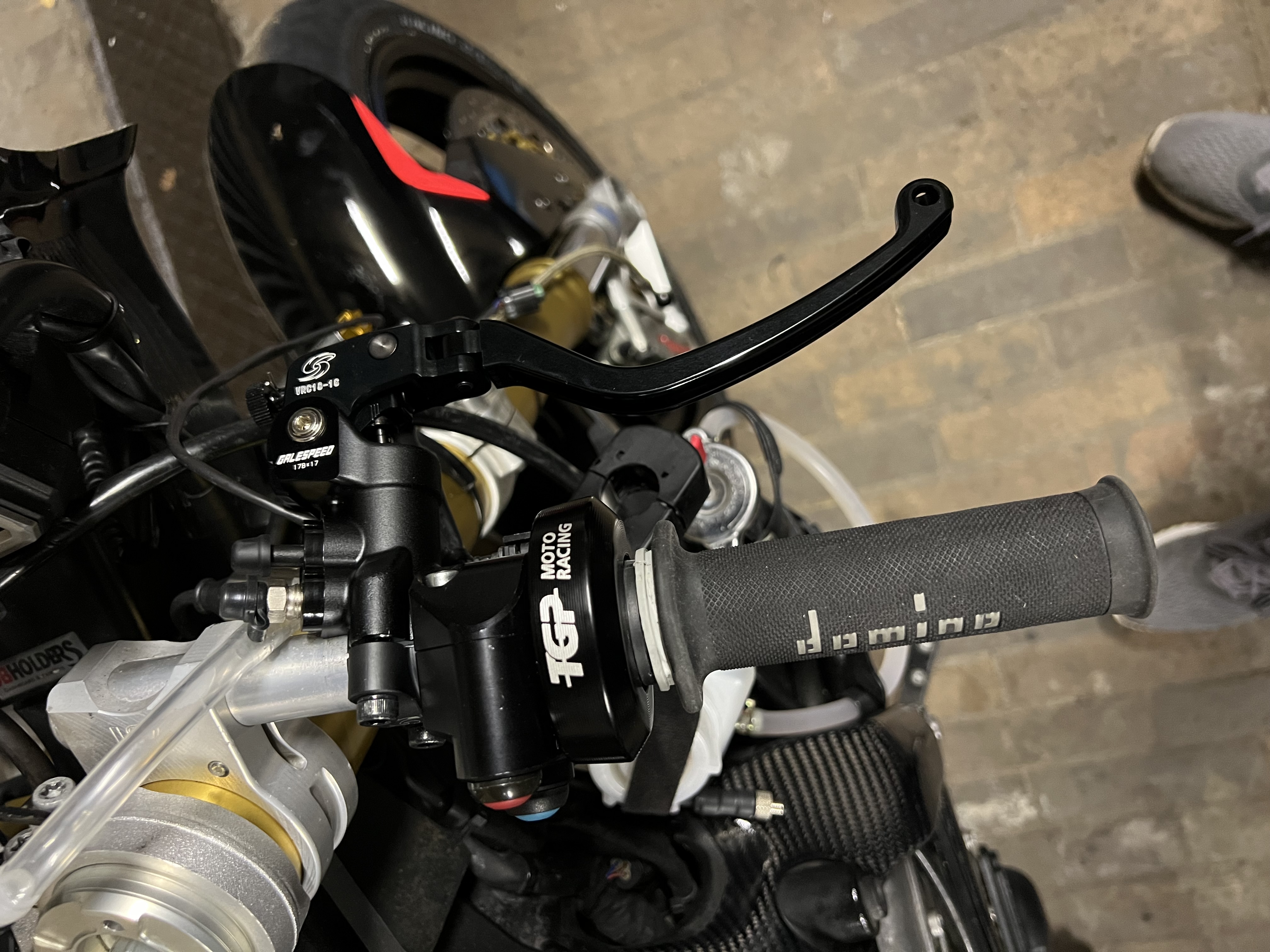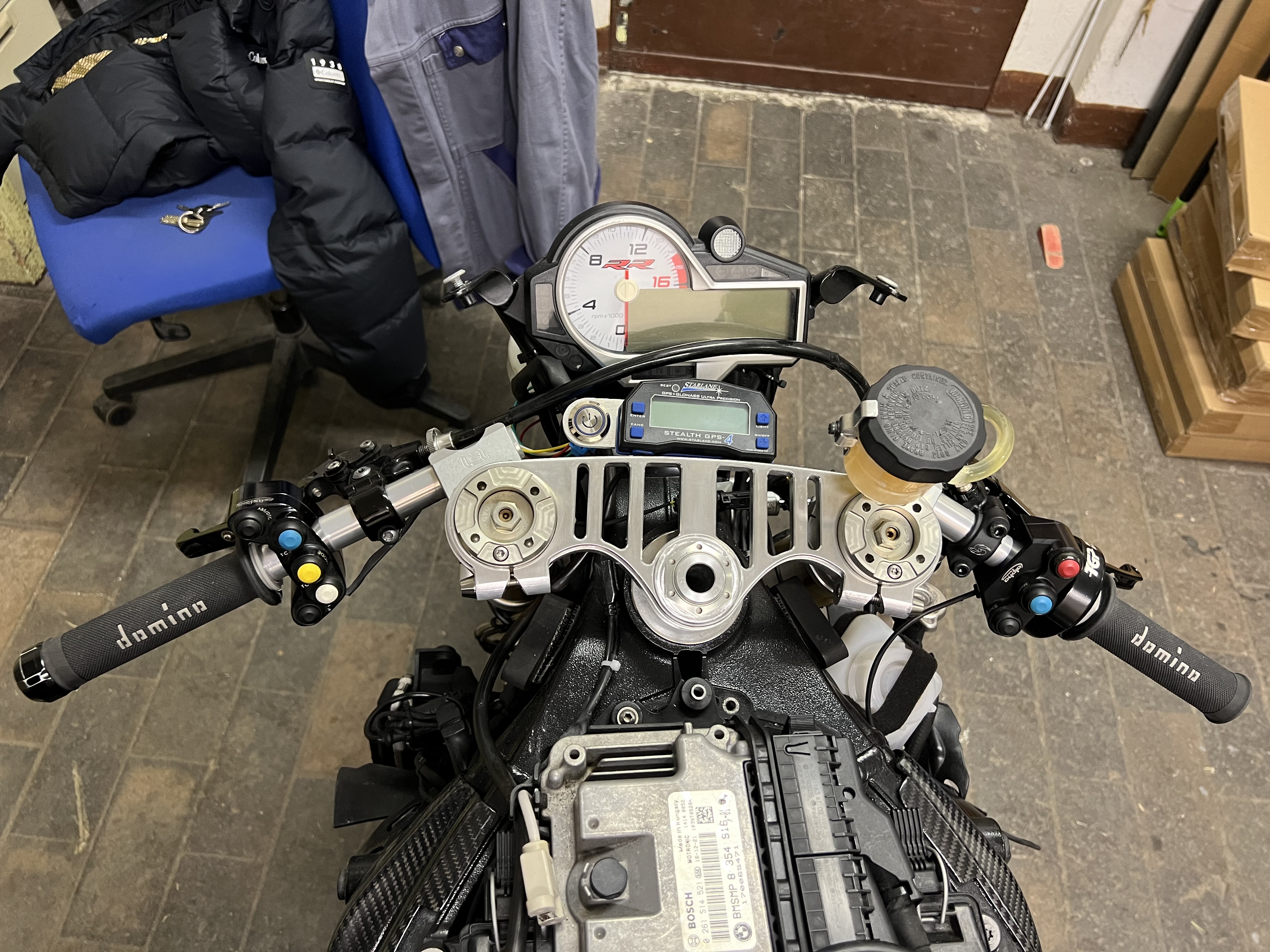 Zusätzlich wurden LSL-Stummel und eine günstige China-Fußrastenanlage verbaut. Außerdem wurde noch auf die Alpha-Racing Schalterarmatur zurückgegriffen. Als letztes ist das ABS ausgebaut und durch direkte Stahlflex-Leitungen ersetzt worden. Ansonsten bleibt die Bremsanlage erstmal, wie sie ist.
