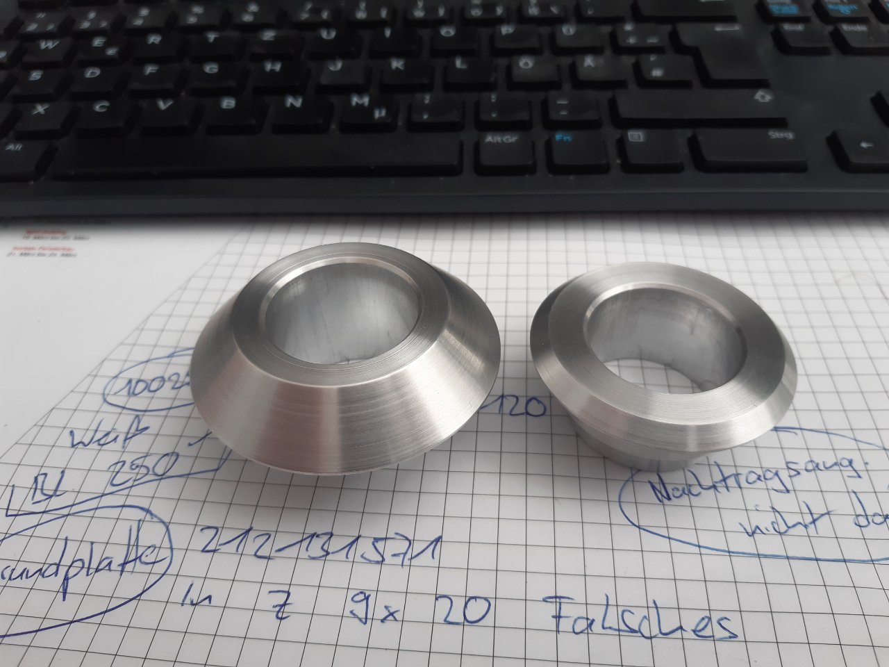 Die Lösung des Problems lag in meinen eigenen Fähigkeiten und Kontakten. Da ich zeitnah keine passenden Teile beschaffen konnte, entwarf ich diese kurzerhand einfach selber und ließ sie mir durch einen bekannten an einer CNC Drehmaschine aus AW 7075 Dura- oder im Volksmund Flugzeugaluminium anfertigen. Das Rohmaterial hierfür gibt es auf ebay.