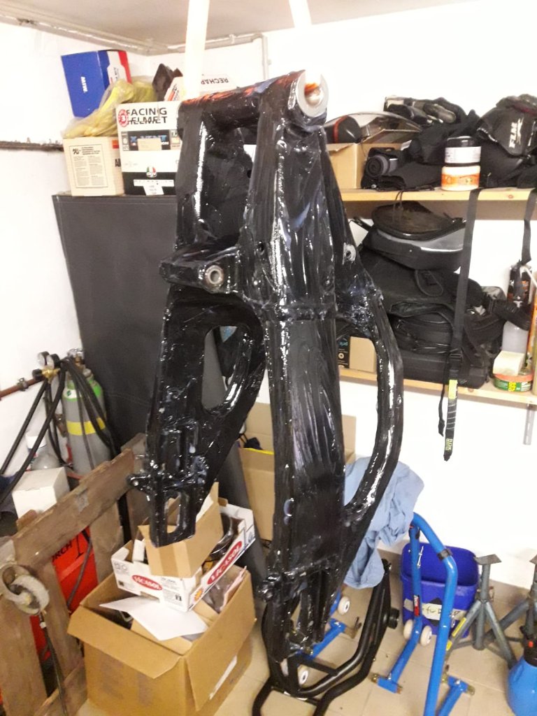 Weil der Rahmen der SRAD nicht in die Pulverbeschichtungsanlage unserer Firma passt und die Schwinge in Schwarz kam, musste eine andere Lösung her. Ich entschied mich dazu die Schwinge zu entlacken.