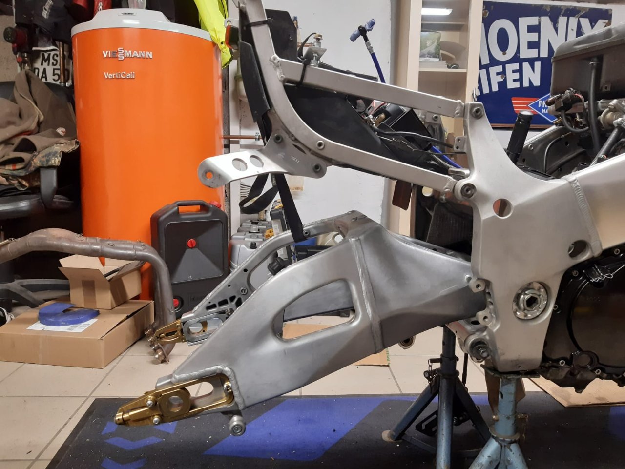 Danach ging es eigentlich ganz schnell – die originale Schwinge samt Lagerhülsen raus. Hierbei fiel auf, dass sie Schwinge vermutlich eh bald andere Wege eingeschlagen hätte, da eine Schraube der Umlenkung wohl vom Vorbesitzer gelöst und dann nicht wieder festgeschraubt wurde. Sie war nämlich kurz davor von selber herauszufallen. Das hätte böse enden können…