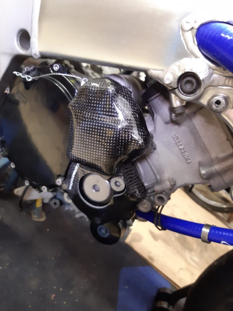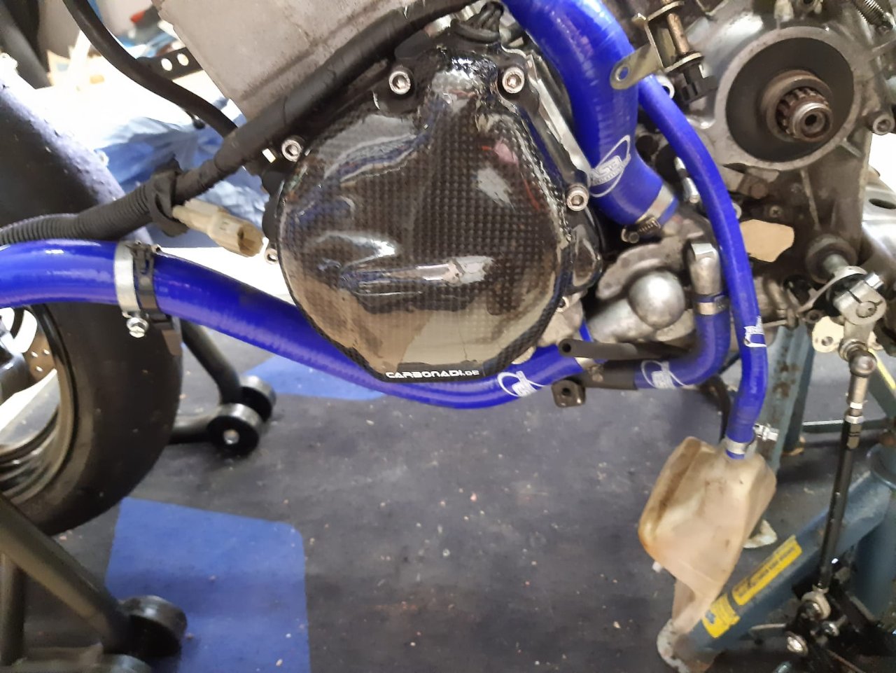 Motorschutzdeckel der Fa. Carbonadi. Der Ausschnitt um an die Schrauben zum Ventile einstellen zu kommen war eine Sonderanfertigung. Falls ihr das auch so haben möchtet, müsst ihr das Anfragen. Die Schutzwirkung ist dadurch zwar reduziert aber mir war es wichtiger, dass ich anständig an meinem Motor arbeiten kann…