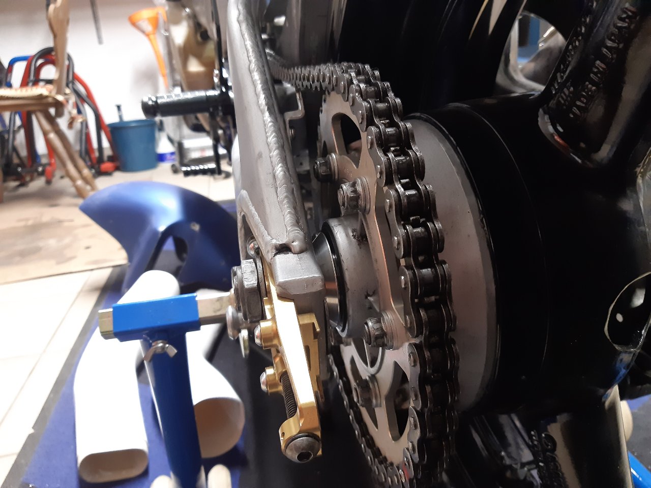 Beim Einbau der Schwinge kamen noch ein paar Details dazu. Zum Beispiel die Kettenfinne, die ich aus einem Blech angefertigt habe. Die Gewinde zum Montieren habe ich einfach selber an der Schwinge angebracht.