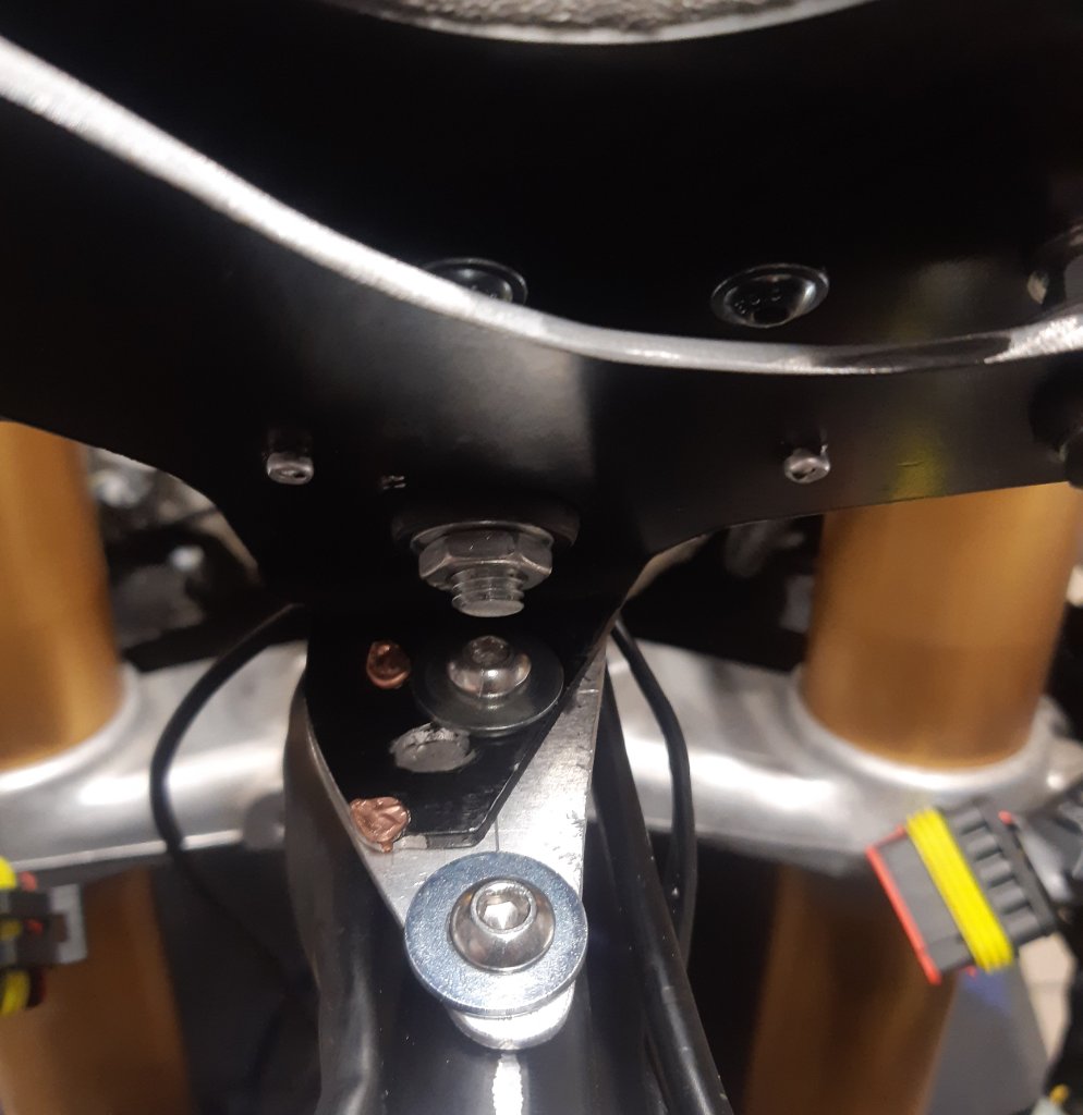Apropos Tacho - weil dieser zu weit vorne saß, musste ich mir etwas einfallen lassen. In diesem Fall ein gesägtes und gefeiltes Blech, dass ich an den abgesägten Teil des Motoholders Geweihs genietet und dann mit Einziehmuttern an den Halter geschraubt habe.