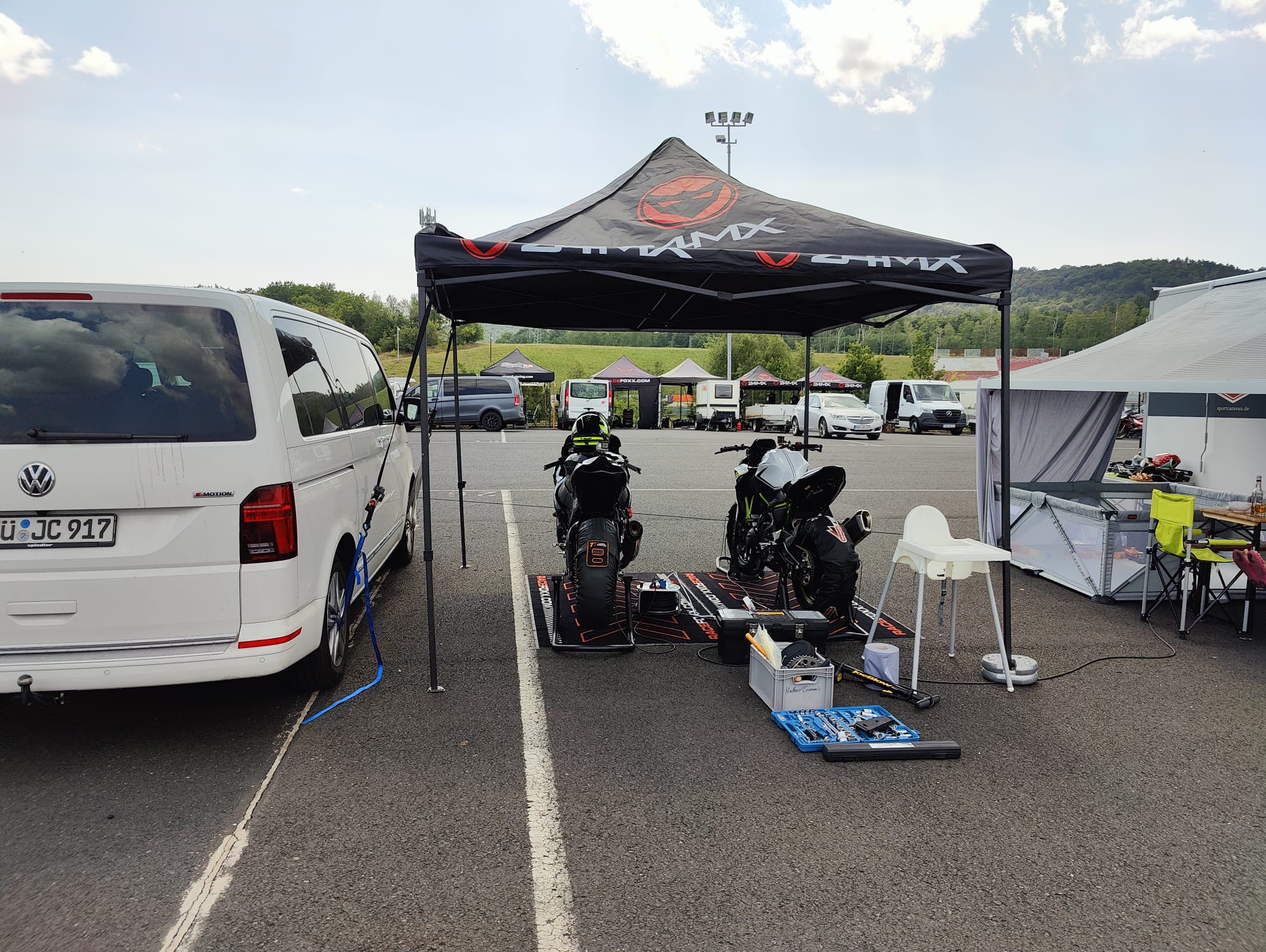 Da fiel mir der Eybis-Termin ins Auge. Praktisch in der Nähe und direkt nochmal Hockenheim klang gut für nen Vergleich zum vorherigen Event. Also gebucht und es ging gefühlt auch schon direkt los. Das es in der Besetzung deutlich mehr Aufwand ist als alleine mal kurz hinzufahren kann sich jeder mit Kids vorstellen. Zumal ich die Blicke immer geil finde wenn ich die Tür vom Caravan öffne und da erstmal Fahrzeuge bis maximal 14 Zoll Radgröße rauskommen :lol: gefolgt von nem Freilauf von ca. 4m² sowie zwei Pavillions. Írgendwann zum Schluss kommt dann mal ein Motorrad. Aber hey, wo soll der Motorsport Nachwuchs herkommen? 8)