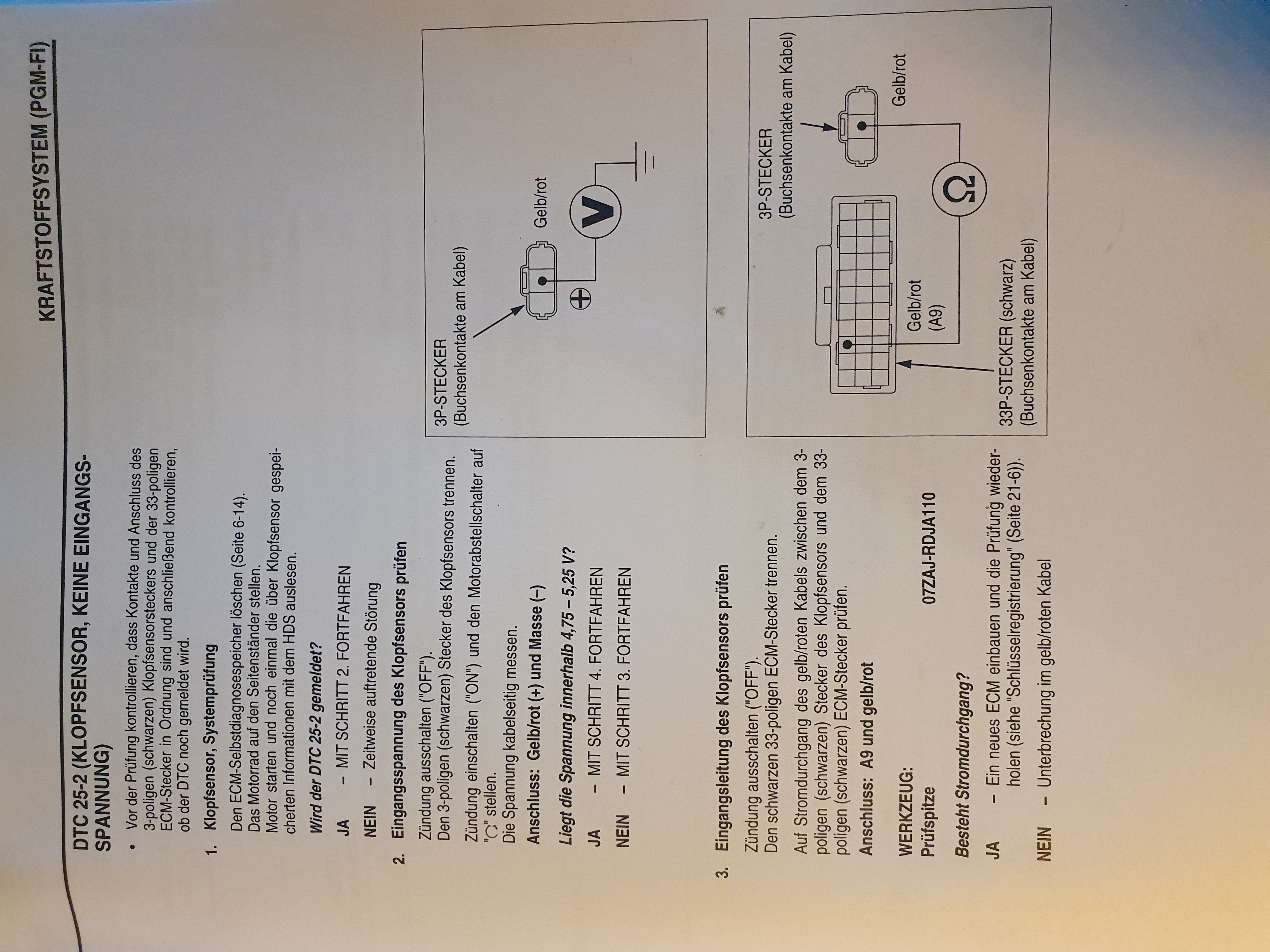 Für Fehler 25 heißt es im Werkstatthandbuch, dass es ein Problem mit dem Klopfsensor geben soll. Hab ihn gemessen, kommt kein Strom an.