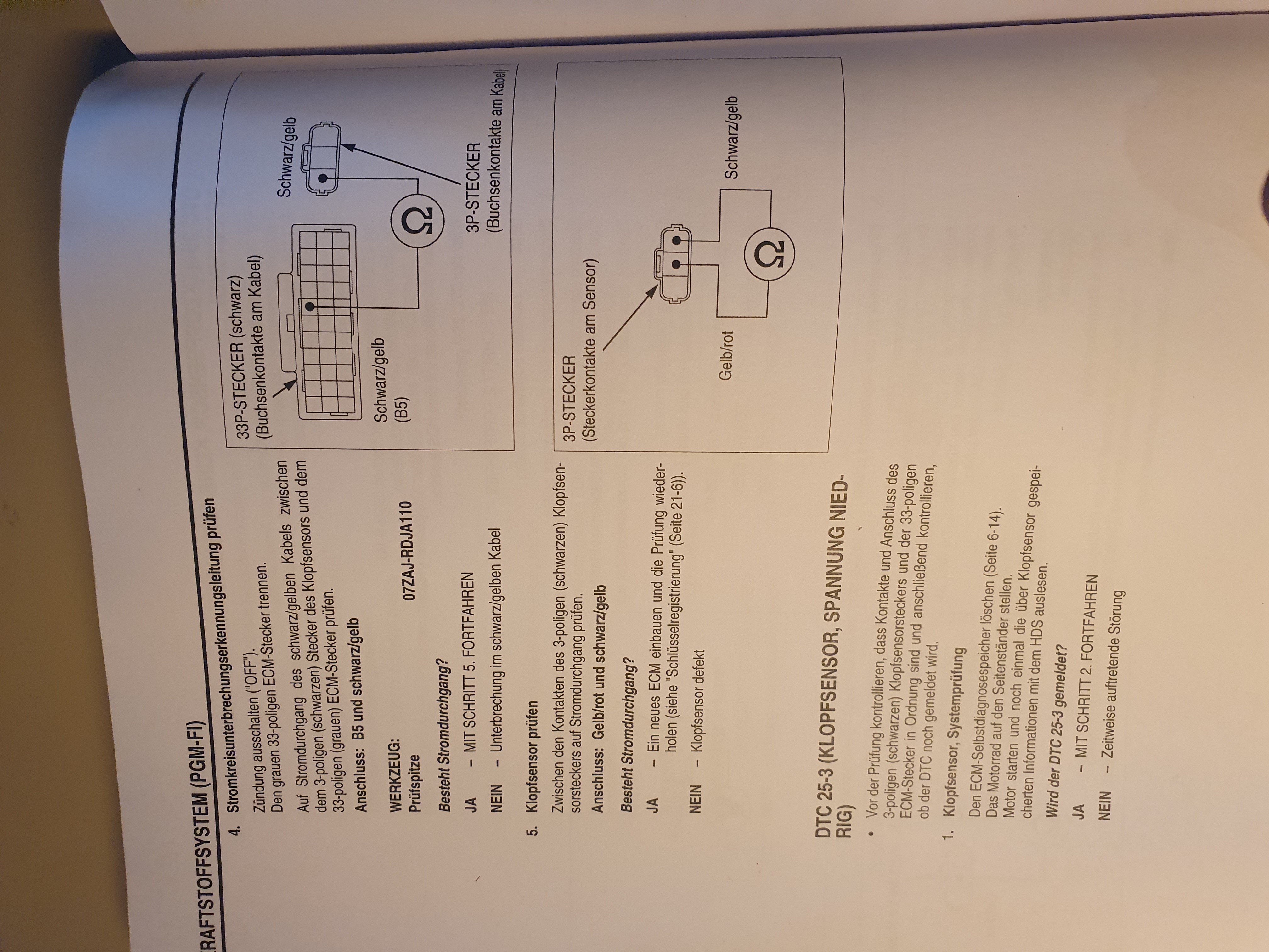 Für Fehler 25 heißt es im Werkstatthandbuch, dass es ein Problem mit dem Klopfsensor geben soll. Hab ihn gemessen, kommt kein Strom an.