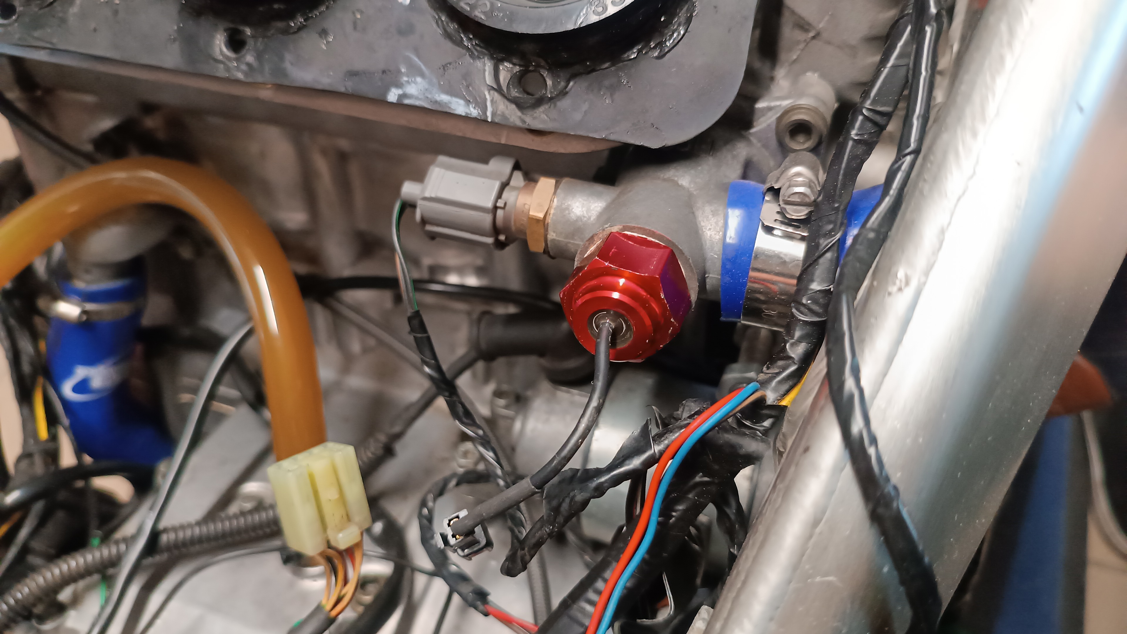 Um die Temperaturanzeige zu "korrigieren", konnte ich von Koso einen passenden Sensor beschaffen, der statt dem überflüssigen Sensor des Kühlerlüfters ins Thermostatgehäuse eingeschraubt wird.