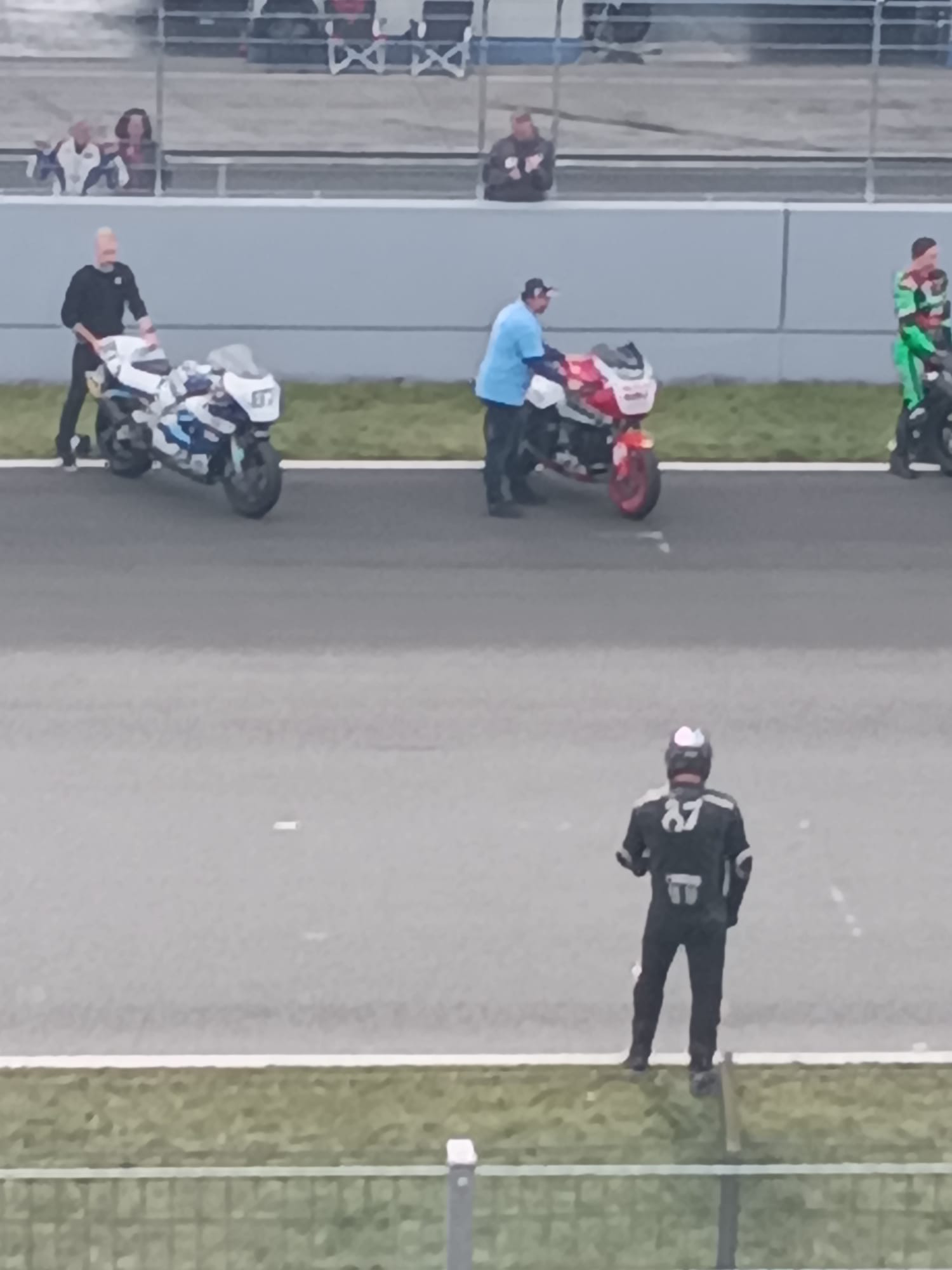 Nach einem kalten Q1, bei dem ich wegen des starken Windes nur eine 1:43 schaffte (schnellster Fahrer 1:42) lagen die Hoffnungen aller auf dem Q2. 10 Minuten vor Beginn der Session kam eine Regenwand über die Strecke gezogen. Somit war der Arbeitstag beendet und die Pole Zeit lag tatsächlich bei 1:42. 😂