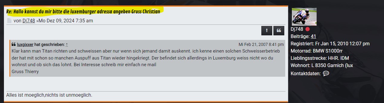 luxgixxer hat geschrieben: ↑Mittwoch 21. Februar 2007, 20:41 Klar kann man Titan richten und schweissen aber nur wenn sich jemand damit auskennt. ich kenne einen solchen Schweisserbetrieb der hat mit schon so manchen Auspuff aus Titan wieder hingekriegt. Der befindet sich allerdings in Luxemburg weiss nicht wo du wohnst und ob sich das lohnt. Bei Interesse schreib mir einfach ne mail