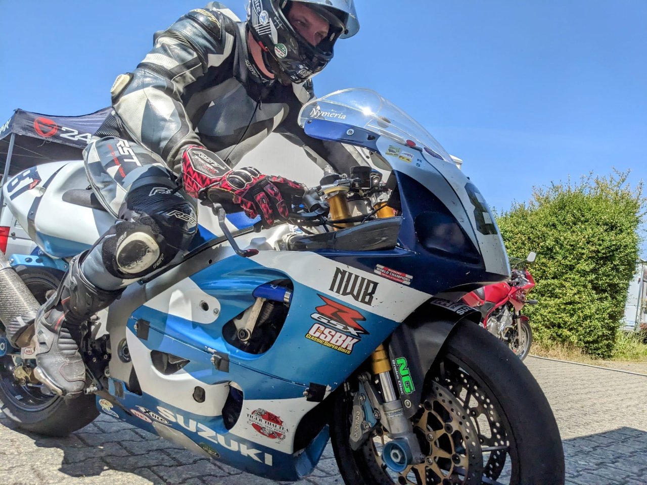 Am Trainingsfreitag traf mich im ersten Turn fast der Schlag. Das Motorrad legte sich fast von selbst in die Kurven und ich konnte es reinlaufen lassen wie noch nie! Allerdings war das so ungewohnt, dass ich keine einzige Linie traf. Das stellte sich dann erst im Laufe des Tages ein. Nach einem erfolgreichen Trainingstag wollte ich dann zusammen mit Bernd Kreuzer das 2H GEC Langstreckenrennen in Angriff nehmen. Nach einem tollen Start fing es leider nach einigen Runden an zu Regnen und ich entschloss mich in die Box zu fahren. Nach Rücksprache mit Bernd packten wir unseren Kram zusammen, da wir beide keinen Crash riskieren wollten und die CSBK Rennen im Fokus standen.