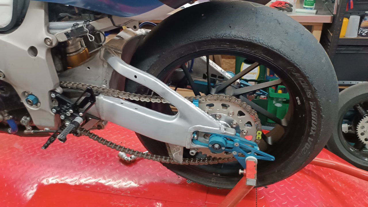 Zurück also in die Werkstatt, denn es stand ein „Double-Header“ an. Am Wochenende nach Walldürn ging es nämlich fast direkt auf die frisch asphaltierten Weiten des Autodrom Brno für die CSBK Läufe 3+4. Zum Glück wurden das Federbein und die Frästeile rechtzeitig hierfür fertig und ich konnte nach einiger Fahrzeit um die Teile abzuholen das Motorrad rechtzeitig fertig stellen. Trotz meiner immer währenden Befürchtungen mich irgendwo vertan zu haben, passte die Felge perfekt in die Schwinge und die Kette war direkt perfekt in der Flucht.