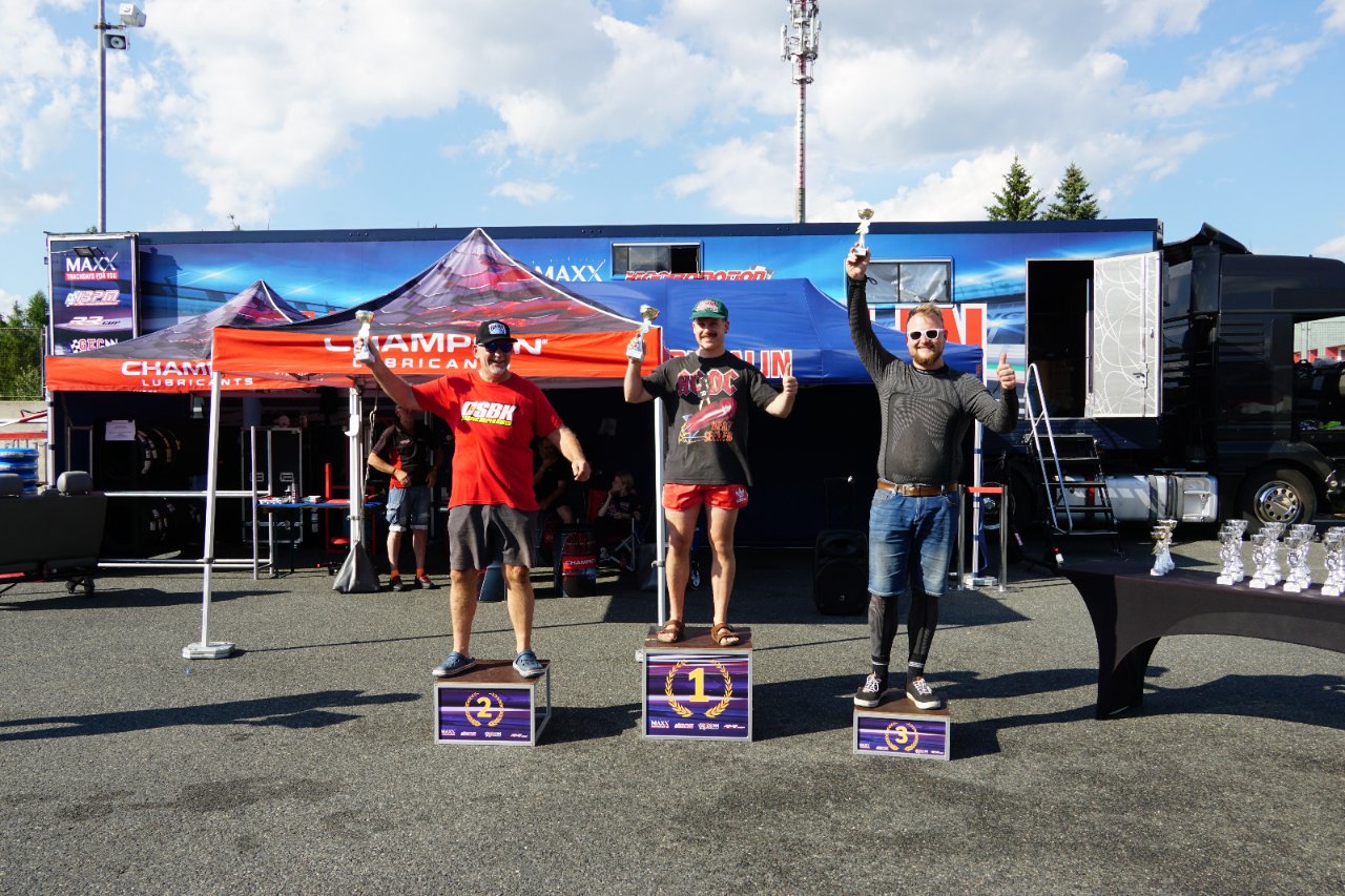 Die Rennen waren allerdings eine harte Probe. Bei gut 35°C startete Rennen 1 und wurde nach einer halben Runde wegen einem Sturz genau vor mir abgebrochen. Nach einer Weile kam dann der Restart bei dem ich super von der Linie weg kam und mich hinter der schnellen #14 aka Bernd Kreuzer einreihen konnte. Nach einigen Probeansätzen konnte ich mich dann endlich an Bernd vorbeibremsen und die Flucht nach Vorne ergreifen! Auch Reinhard Strack viel mir kurz danach zum Opfer und nach einem kleinen Kontakt mit einem Sandsack kam bald endlich die ersehnte Zielflagge. Es war einfach viel zu heiß…