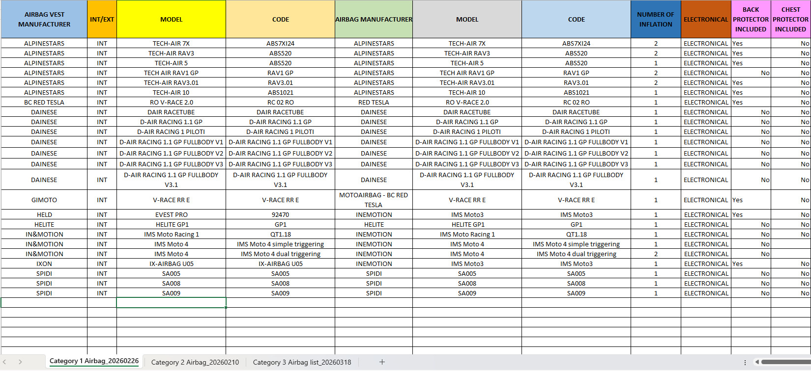 Die Norm im Rennsport wird von der FIM vorgegeben, hier die zugelassenen Airbag Systeme der Cat.1:
