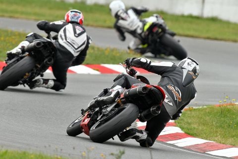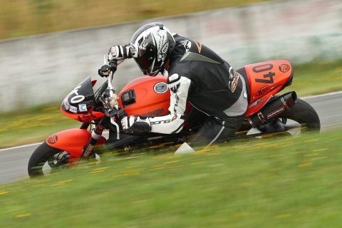 Am Samstag gegen 9.00 Uhr stand das erste und einzige freie Training auf dem Programm. Leider hatte es die Nacht heftig wie aus Eimern geschüttet, weshalb ein Teil der Strecke noch recht feucht war. Trotzdem wollte ich die Chance nutzen und die ersten Meter unter die Räder nehmen. Ketchup bereitete die Streety vor und ich ging pünktlich auf die Strecke. Der erste Eindruck war natürlich vollkommen ungewohnt. Ich ertappte mich dabei, wie ich über den Sinn der Aufzünderei nachdachte. Nach aber nur einer gefahrenen Runde waren die Gedanken weg und ich konzentrierte mich auf die Strecke. Runde um Runde ging es flüssiger und besser. Ohne Laptimer drehte ich meine Runden und sortierte meine Extremitäten auf dem Bike. Nach wenigen Runden und trotz feuchter Stellen begann es schon Spaß zu machen. Da war es wieder. Das einzigartige Feeling mit gleichgesinnten ein schönes Asphaltband schnellstmöglich zu überfahren. Das Kratzen der Knieschleifer auf dem Asphalt, das blubbern des Auspuffes und und und. Die Dinge, die einem die Rennerei zur Sucht machen. Herrlich!