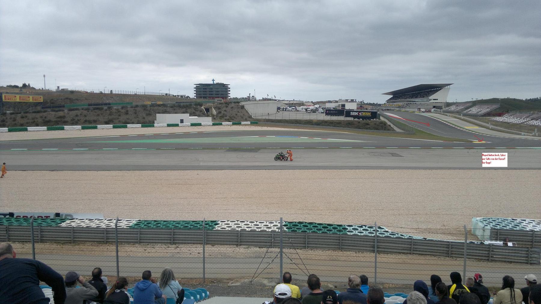 Sykes ist raus aus der Box und gleich in der ersten Kurve voll ueber die Kurbs aber so richtig drueber!! Moped ist hinten hochgeflogen und den Sykes hats mit Salto von der Kawa gebuegelt. Voll aufs Becken.....hat auch erstmal gehumpelt. Die Kiste ging auch schwer wieder an. Haben die noch kein Anlasser drin?