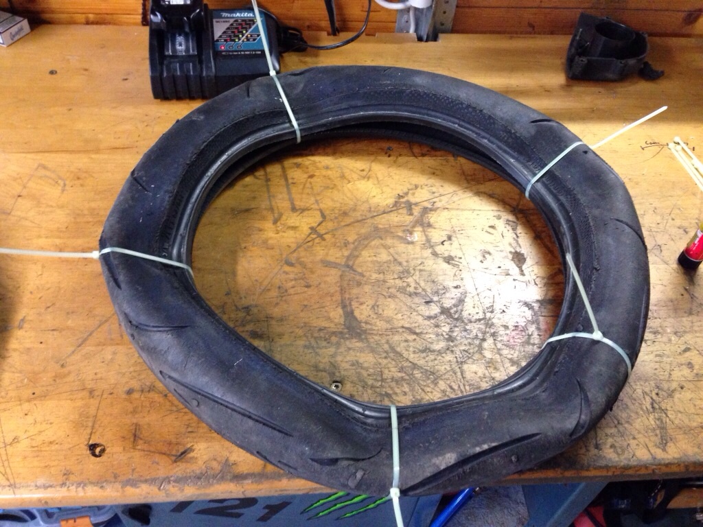 Kabelbinder rauf - Felge hinlegen - mit dem Knie raufdrücken - fertig