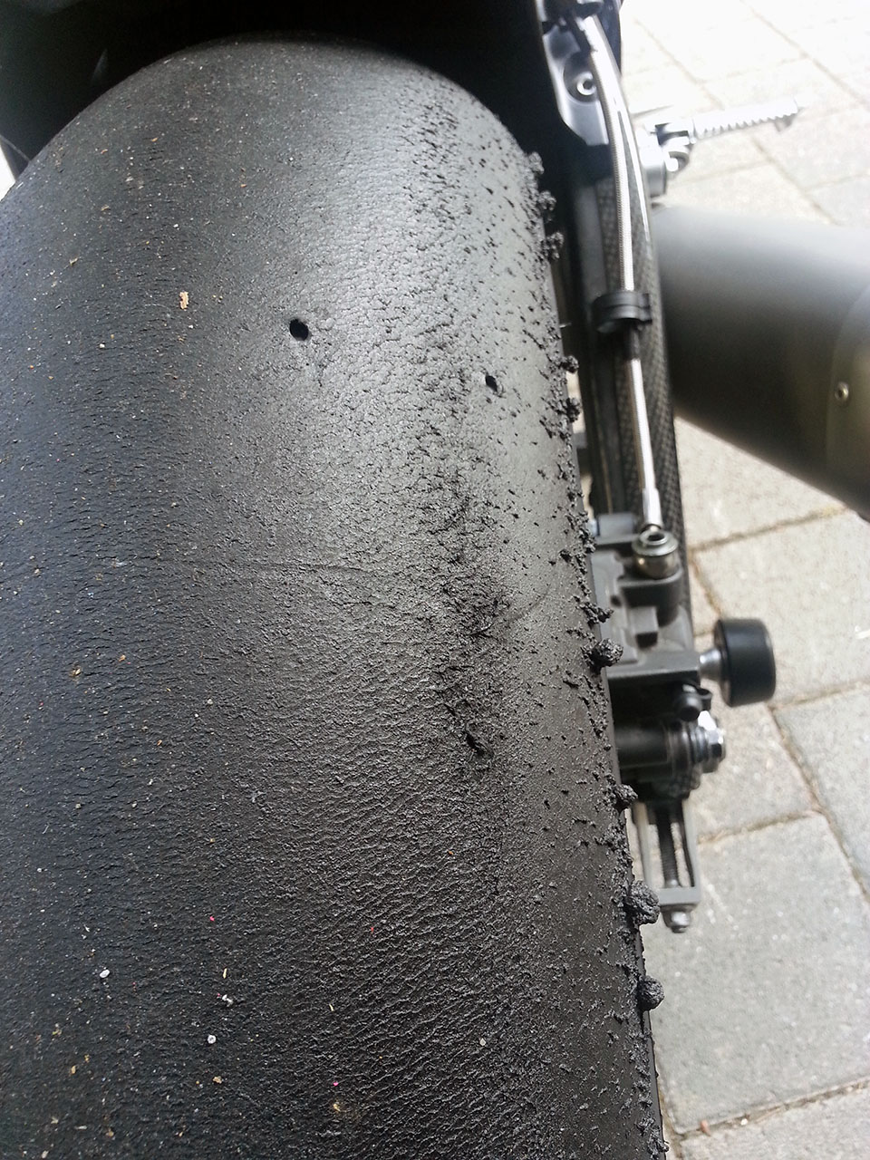Leider konnte ich im trockenen nur 3 turns fahren, und nach dem ersten turn war noch nichts weiter zu sehen, erst nach dem dritten sah es so schlimm aus, ich denke mal noch 3 turns und der Reifen wäre hinüber.