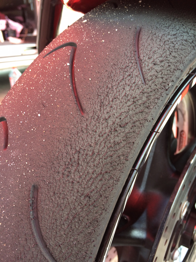 Dein Reifenbild lässt stark vermuten, dass dein Fahrwerk noch nie für den Renneinsatz bzw. auf die Slicks abgestimmt wurde.