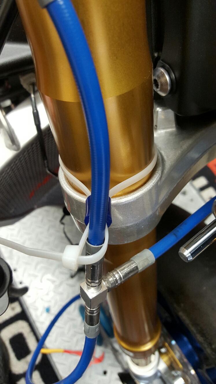 Eine Leitung von der Pumpe zur unteren Gabelbrücke, dann T-Stück und von dort