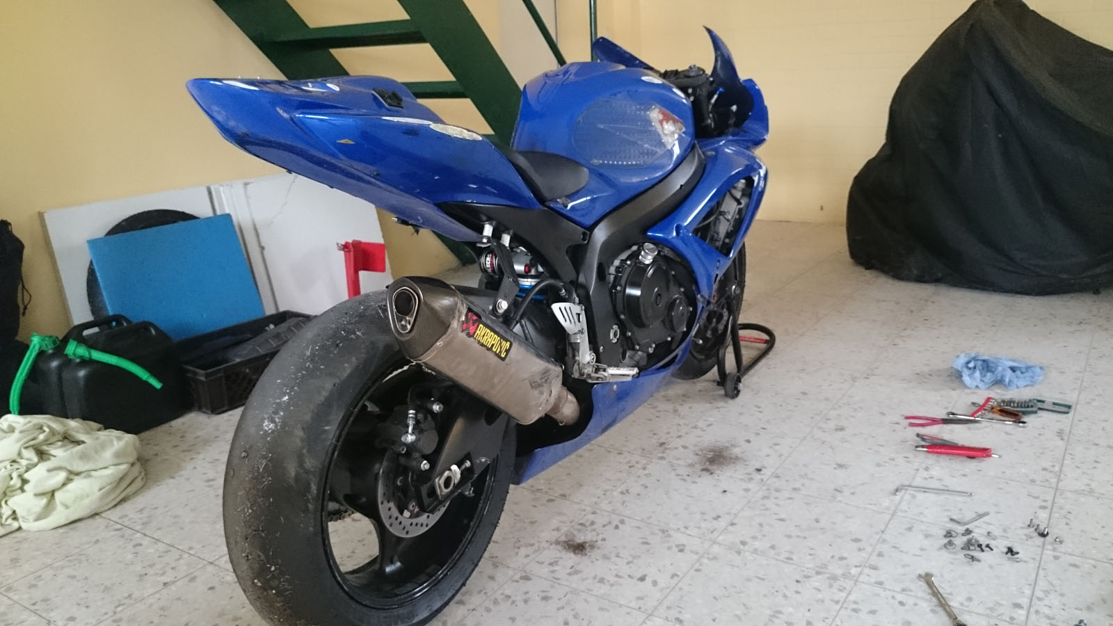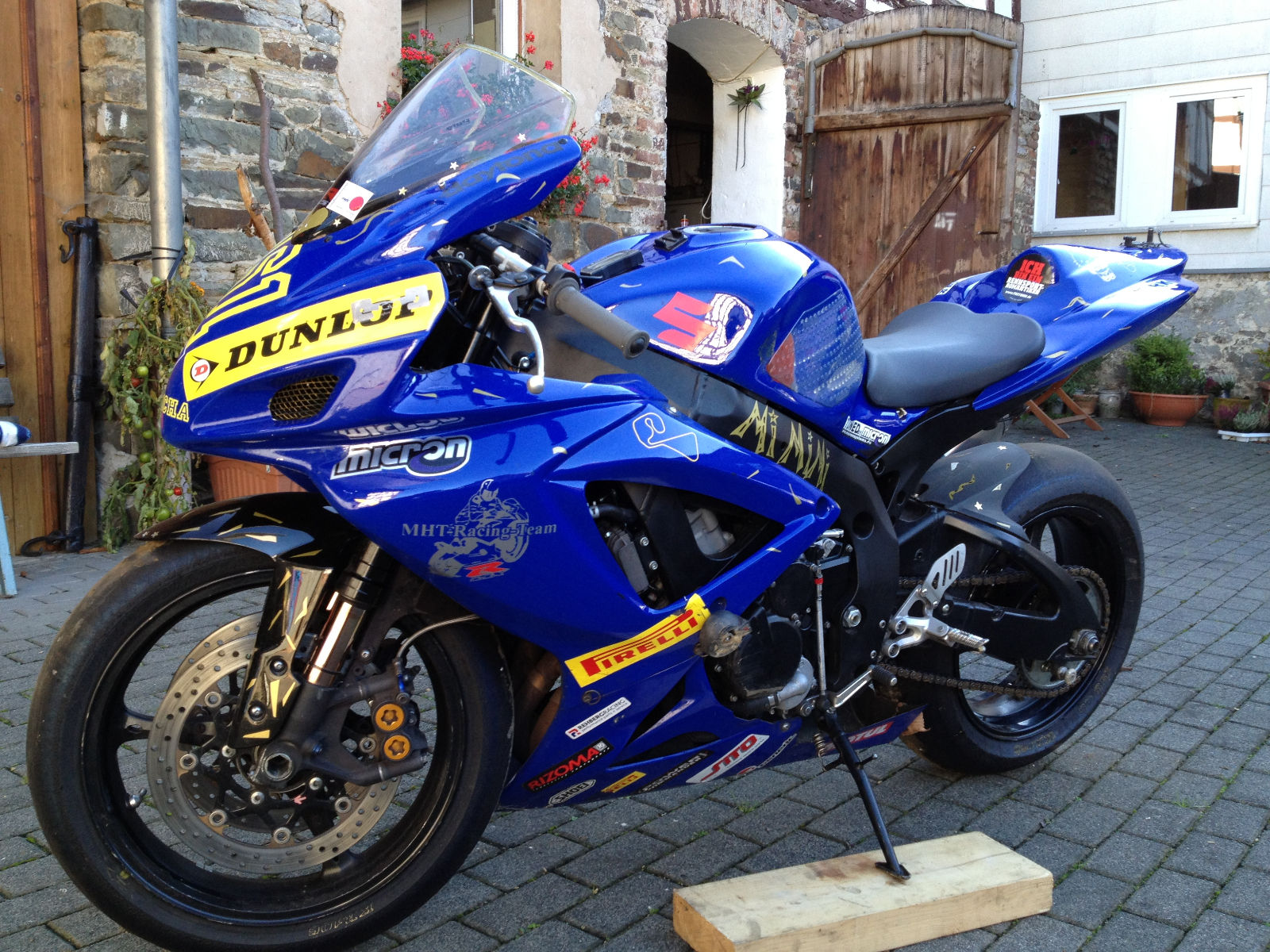 Wie bereits berichtet habe ich mich für eine 750er K6 entschieden. Diese kam direkt im Renndress. Sozusagen ein Rundumsorglospaket für den Einstieg. Gemacht war schon: Cordona Schaltautomat, PT Tuner, R6 Bremssättel, Akra Endtopf, Wilbers Federbein und vorne überarbeitet und eine Rennverkleidung. Reifenwärmer gab es auch dazu.