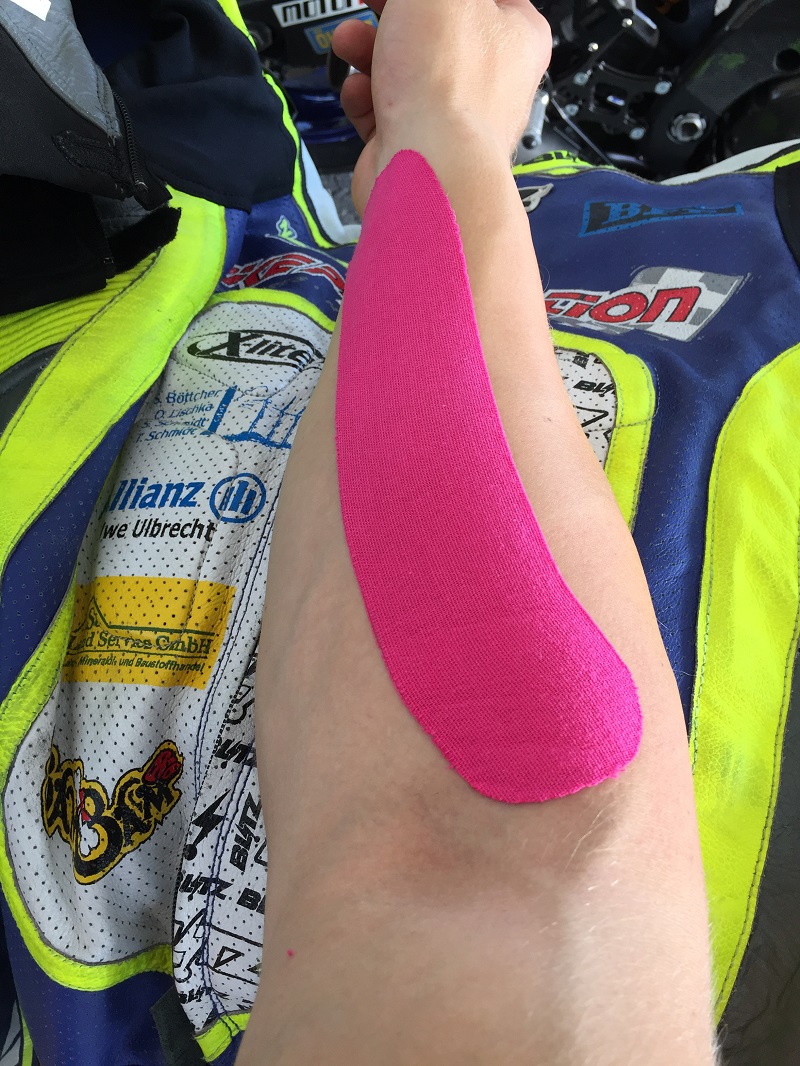 Ich habe zunächst den Arm eingecremt, gedehnt und dann tapen lassen.