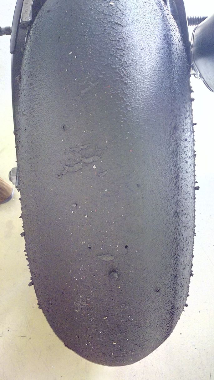 Der Reifen bekam bei mir bis zum Mittag ca. 150km drauf und er hatte nicht den Hauch einer Abnutzungserscheinung. Alle Indikatoren waren noch voll auf der „Höhe“! Das für den Lausitzring typische Reifenbild war auf keinem der Motorräder und bei keinem Fahrer zu erkennen. Das heißt, egal bei welchem Motorrad, alle Reifen sahen einfach nur TOP aus!