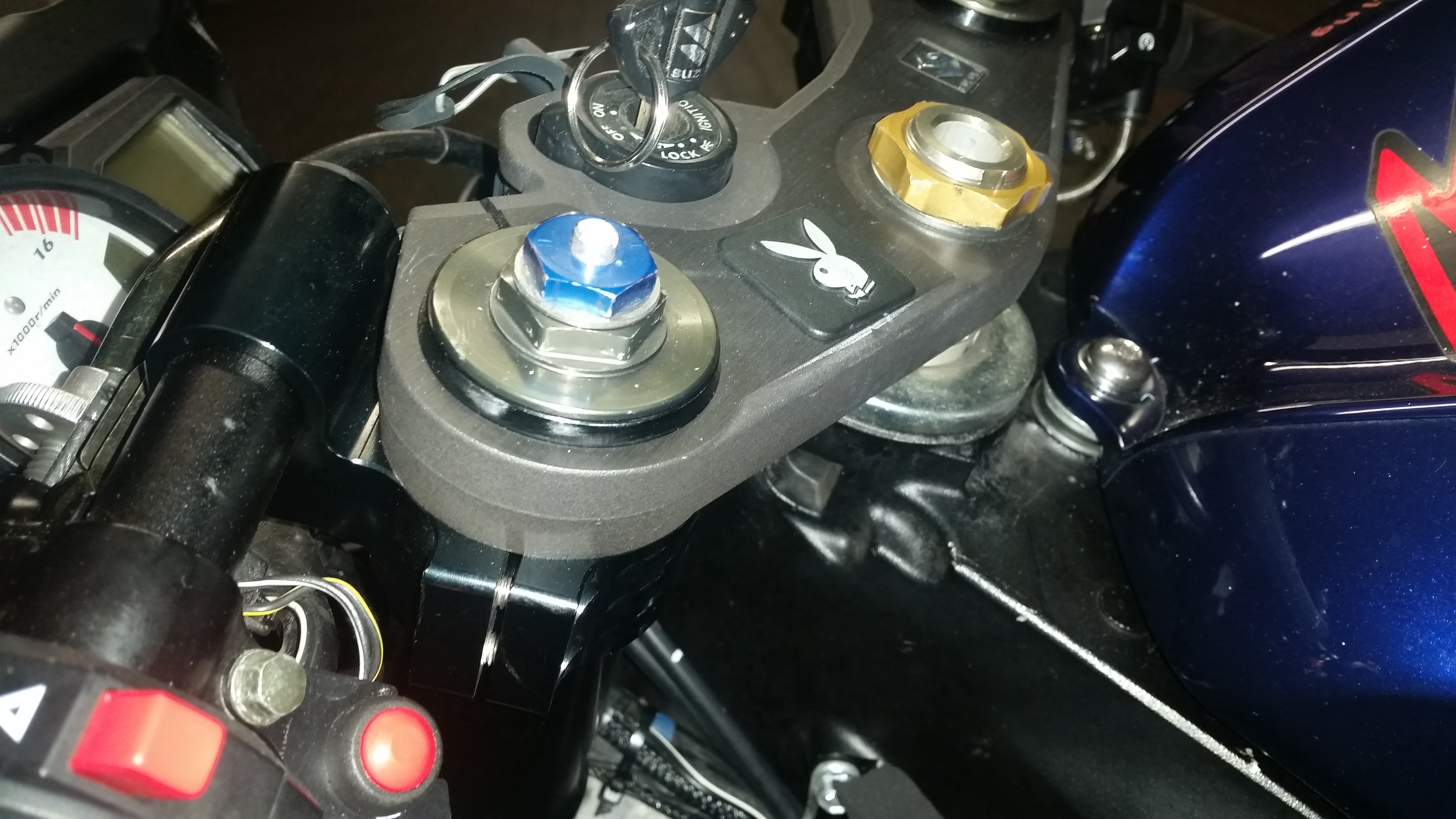 Die wird über den blauen Sechskant eingestellt. Kann sein, dass die GSXR Gabeln lange Topoutfedern haben. Dann ändert sich an der reinen Fahrzeughöhe nicht viel im Stand.