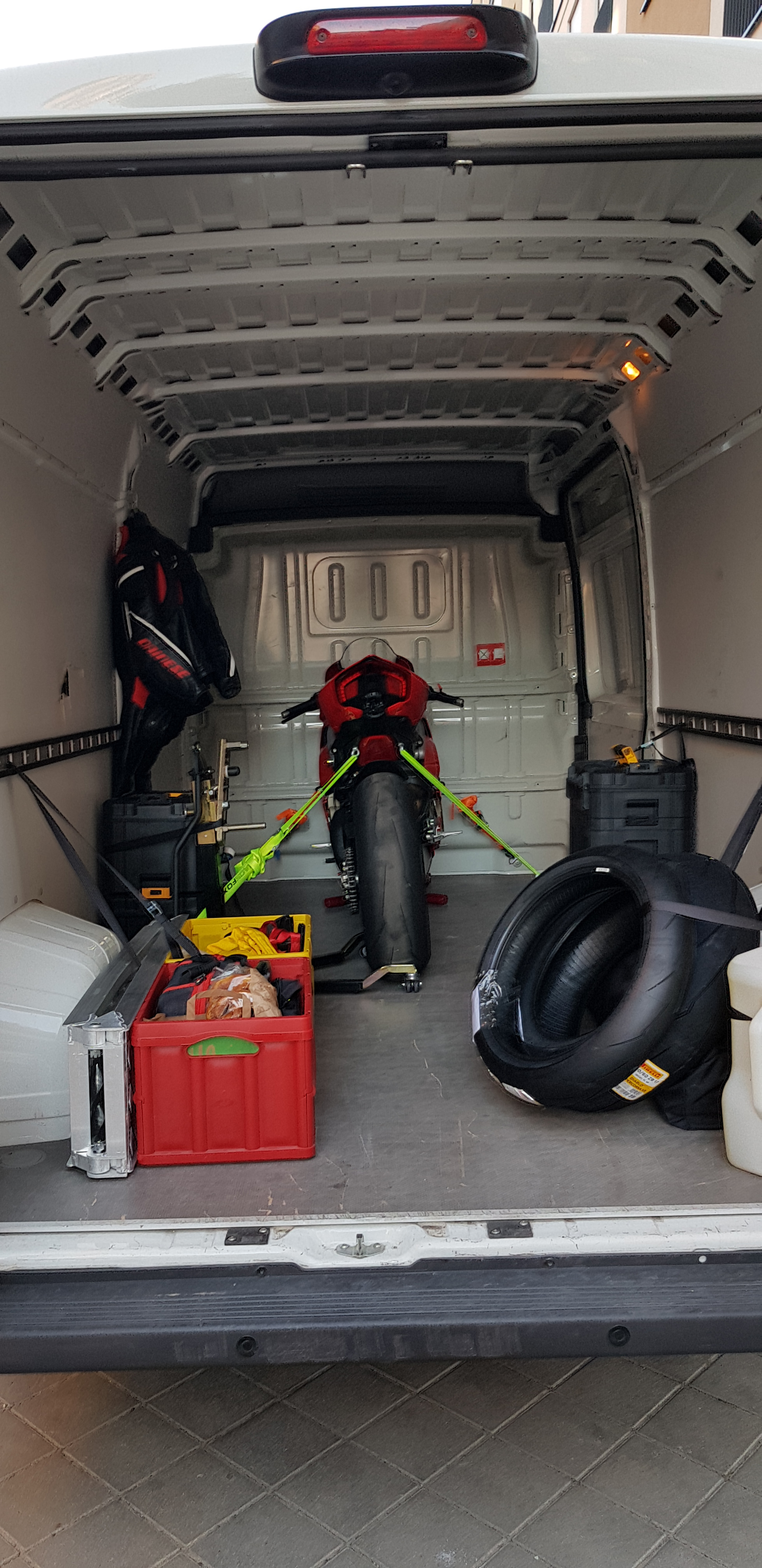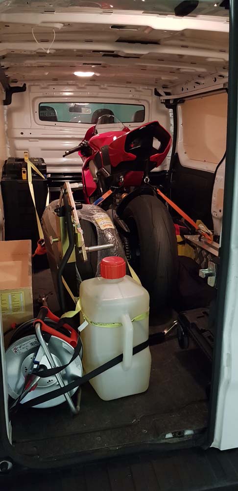 Sonstiges Transportgut hält sich in Grenzen - das übliche: Kombi, Helm, Klamotte, Bursigständer, ein bisschen Werkzeug, Reifen, Bezinkanister. Im L2H2 Transporter ist gefühlt zu viel Platz.