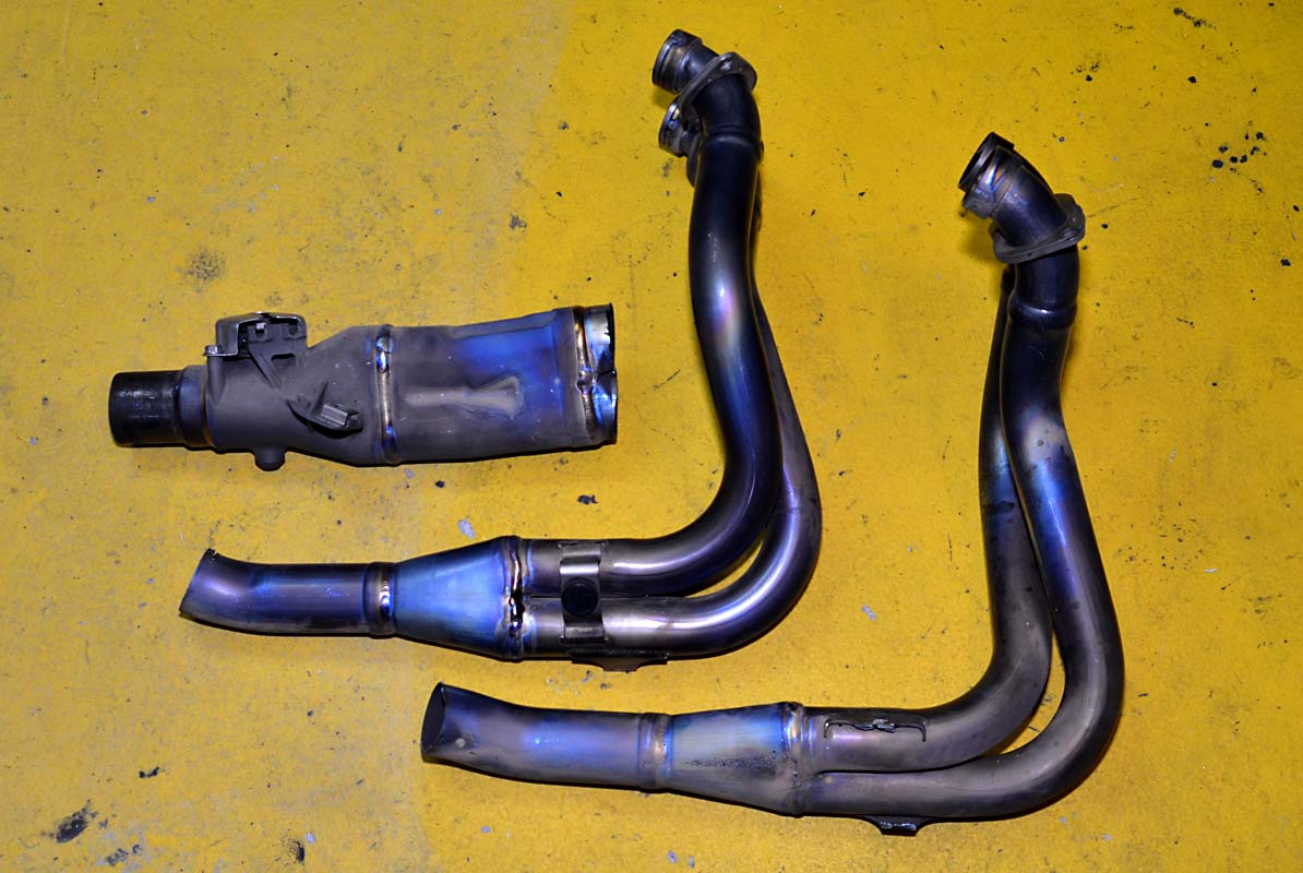 Der originale Krümmer ist für Mehrleistung nicht gedacht und daher wenig geeignet. Zudem noch aus Edelstahl und entsprechend schwer. Die gerne verwendeten ARROW Racingkrümmer kosten so runde 300,- € und wiegen dafür 1.800 g. Was liegt also näher, als den Titankrümmer einer ZX10R zu nehmen.