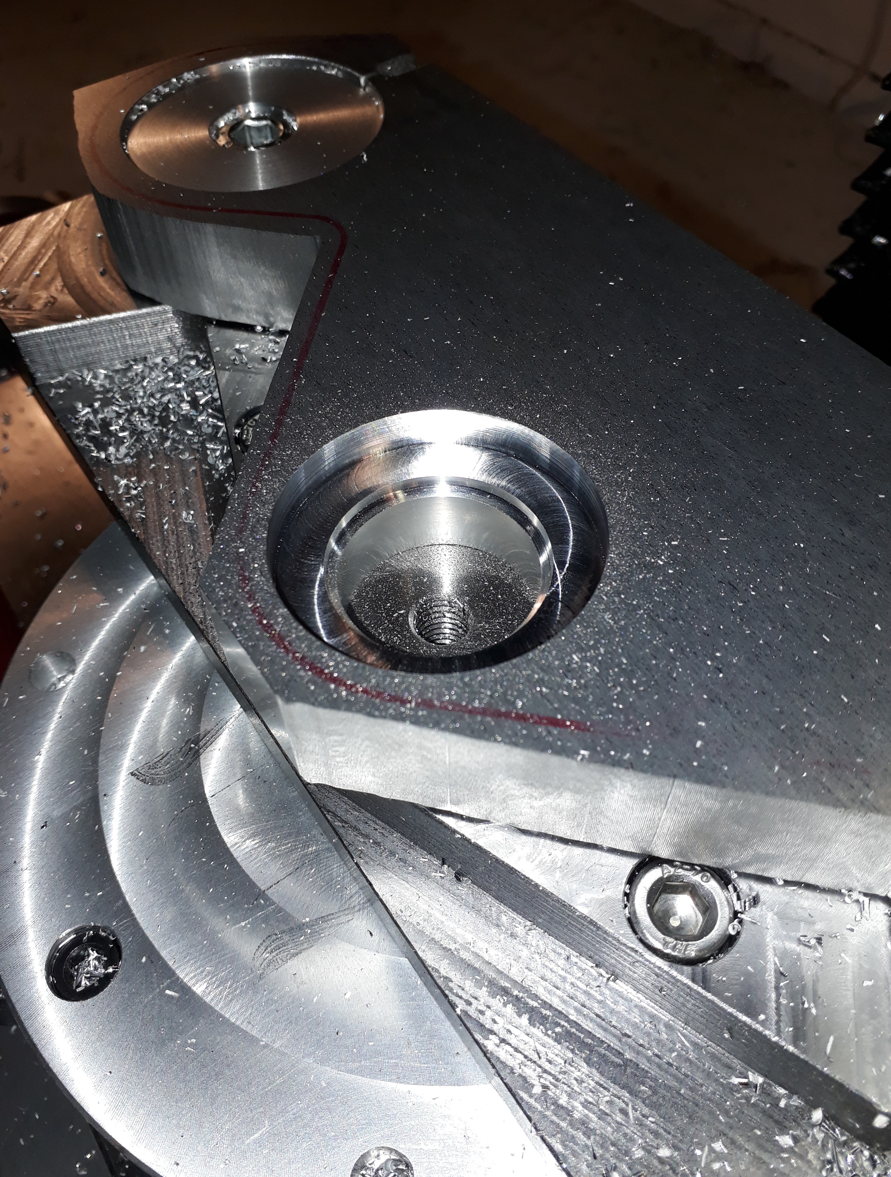 Der zweite Entwurf fürs konventionelle Fräsen war eher um den Faktor 10 aufwendiger. Einfach weil man sich bei jeder Gestaltungsentscheidung genauestens überlegen muss wie man das Teil spannt, wie man die Winkel eingestellt bekommt, wie die Radien entstehen, ob das auf den Rundtisch passt, ob das von der Zerspanungsleistung überhaupt zu packen ist. So kann ich auf meiner kleinen 120kg Fräse ganz sicher nicht die Kontur im Vollschnitt 20mm tief in soeine 7075 Platte fräsen, nichtmal in 1mm Zustellungen. Da will jede Fräsoperation präzise in vorraus geplant sein, sonst steht man am Ende dort mit einem 45€ teuren und 19 bearbeitungsstunden alten wertlosen Klumpen Metall, weil man das Teil für die finale Operation nicht mehr aufgespannt bekommen.