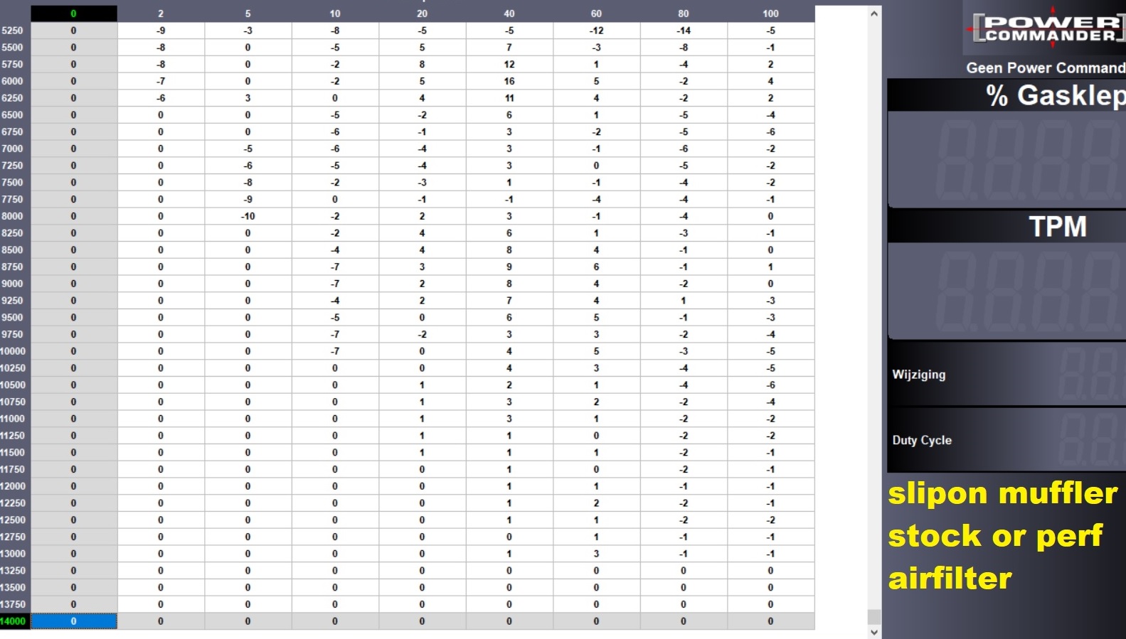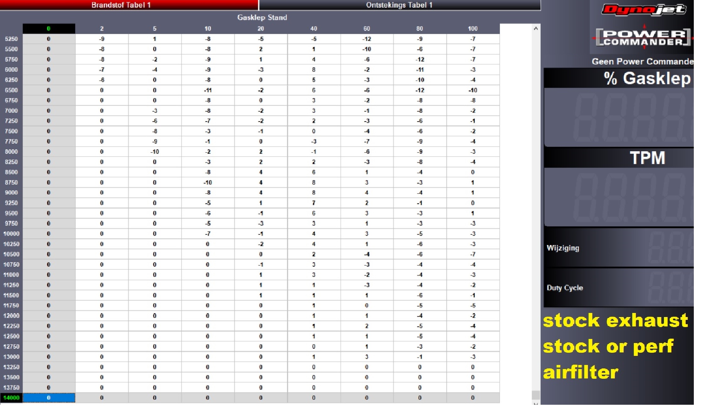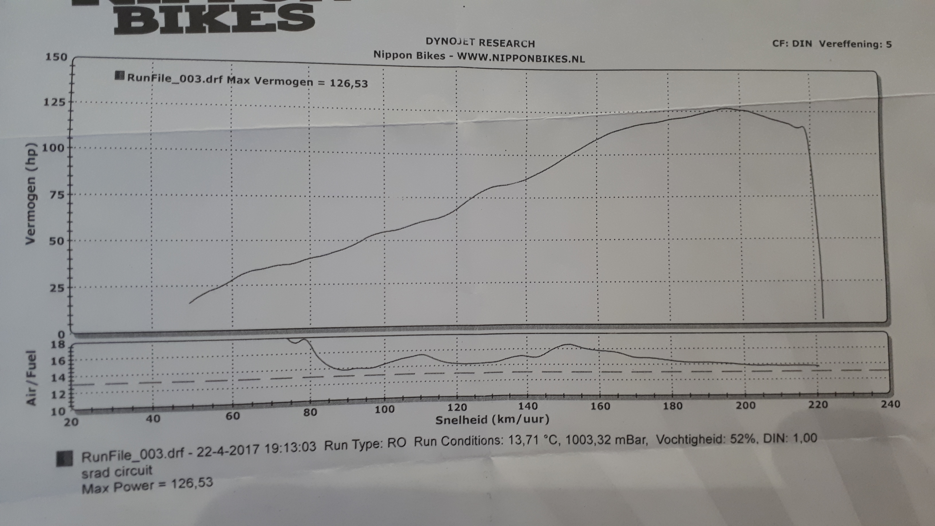 **Edit: Laut Dynojet sollte die PC maps orientiert werden für AFR=13.2 also REICH für leistung, die AFR werte auf das Leistungsdiagram sagen mein MR lauft nehe stoïchiometrisch bis ARM, wieso denn sagen die PC kennfelder WENIGER BENZIN BITTE???? (vielleicht O2 messung falsch??) **