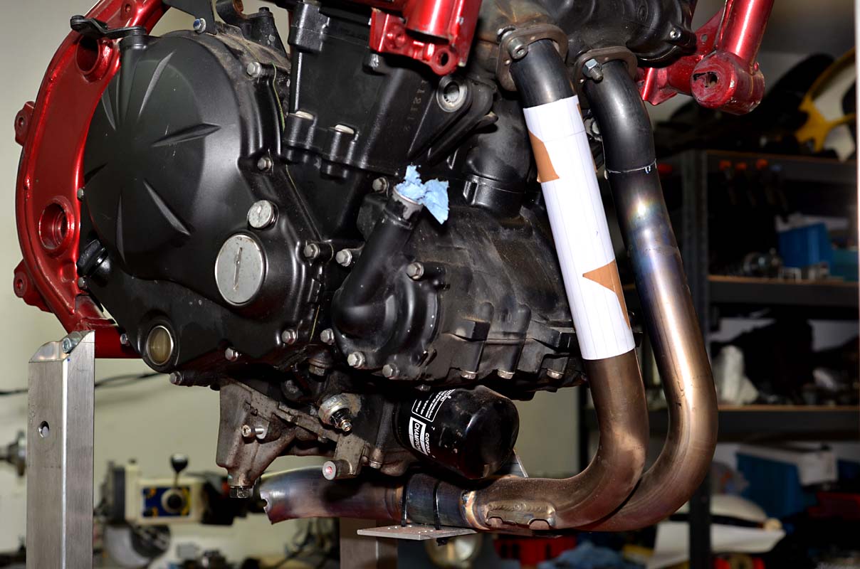 Heute bin ich mit dem Krümmer ein ganzes Stück weiter gekommen. Als erstes mal eine Halterung für den Sammler zusammengeschustert und am Motor befestigt. Damit ist der Sammler fixiert und die zweite Hand frei. den Krümmeranschluss am rechten Auslass befestigt und den Krümmer incl. Sammler nach Augenmaß ausgerichtet. Könnte hinkommen. Das Papier habe ich als Ersatz für ein Stück gerades Rohr genommen. Es lässt sich leicht auf die erforderliche Länge bringen und simuliert gerollt ein gerades Stück Rohr. Da man es auf dem Krümmerrohr gut verschieben kann, ist das ein schneller und leichter Weg, um zu prüfen, ob die Ausrichtung passt. Sie passt!