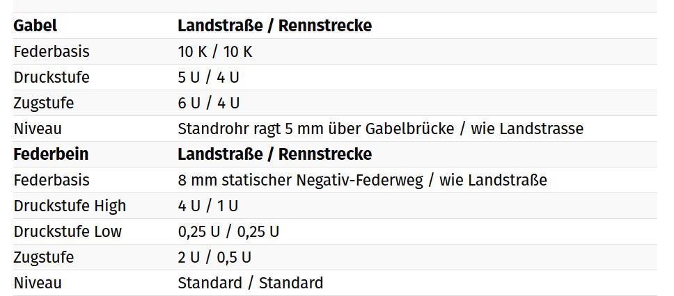 kann mir jemand eine Empfehlung für das Serien Fahrwerk der Suzuki GSX R 750 von 2012 geben. Leider habe ich das Fahrerhandbuch nicht mehr und kann somit die Grundeinstellung nicht nachvollziehen.