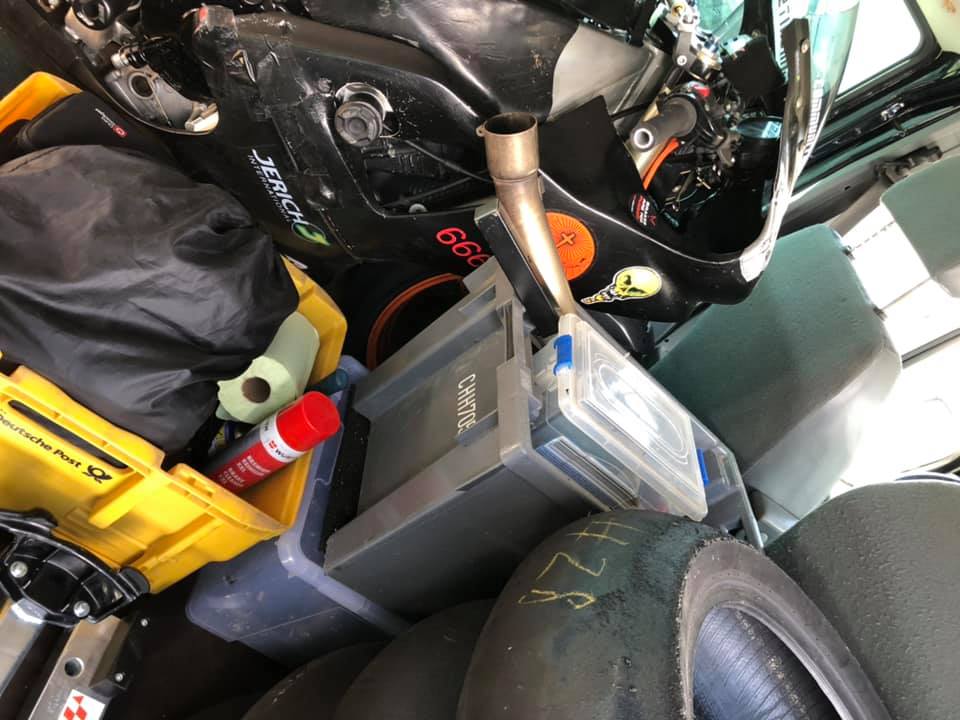 Äh Tanken, Batterie laden, nochmal was trinken, Reifenwärmer nochmal drauf, mit Reifenwechsel für hinten war nix mehr.