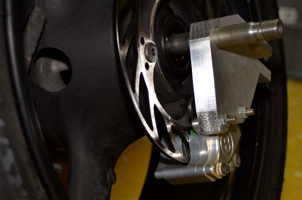 Das passt so weit schon mal. Jetzt müssen der Halter und die Aufnahme der Zange am Halter so ausdistanziert werden, dass die Bremsscheibe in eingebautem Zustand mit allen Distanzbuchsen sauber im Spalt der Bremszange läuft und nirgends schleift.