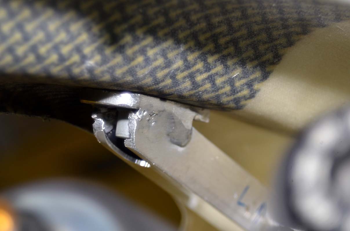Das Problem hier ist es, 3 Ebenen zu beachten. Die erste ebene ist die Auflage des Halters an der Schwinge. Die zweite ist die Aufnahme des Widerlagers an der Schwinge (benötigt ca. 3mm Versatz zur Ebene an der Schwinge). Als drittes noch die Auflage für die Befestigung der Zange am Halter. Ist nicht so ganz einfach, da der Halter mit seinen 20mm Breite nicht eingebaut werden kann. Da stehen die Schrauben der Bremsscheibe an. Also vorher überlegen, wo wohl was weg kommt. Als der Halter montagefertig war, habe ich diesen erst einmal ohne die Bremszange montiert. Danach aus Papier einige Streifen in der Breite der Bremsbeläge geschnitten. Diese mehrlagig als V gefaltet und zwischen die Bremsbeläge geklemmt. In die Mitte der gefalteten Papierstreifen dann die Bremsscheibe. Dadurch ist die Zange, wenn sie leicht klemmt, sauber auf der Scheibe zentriert. Mit einer Reißnadel die Auflage des Sattels auf den Halter übertragen und abschließend das Alu soweit abgetragen, bis die Markierung erreicht ist. Die Methode funktioniert recht gut. Letztlich hat es geklappt und alles Teile haben passend zueinander gefunden.