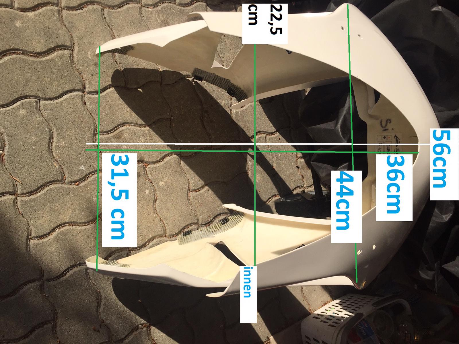 da es sich um eine Rennverkleidung ohne Beleuchtung handelt sollte der Bereich wo bei der Serienverkleidung das Standlicht (Zyklopenauge) sitzt auch aus Glasfaser bestehen wodurch die Originalform der Scheibe auch bei der Rennverkleidung paßt. Dazu sollte Dir doch SM was sagen können
