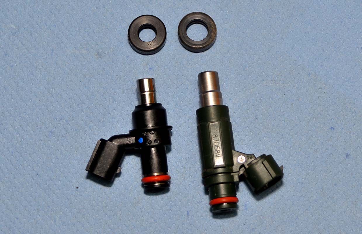 Auch wenn der Unterschied der beiden Einspritzdüsen erheblich ist, lässt sich die ER6-Düse mit dem Gummi aus der ER6 Einspritzanlage einfach in die Einspritzanlage der ZX10R einbauen. Muss dann nur die Sprittanschlüsse der beiden Düsen herstellen. Links die ZX10R Düse und rechts die der ER6.