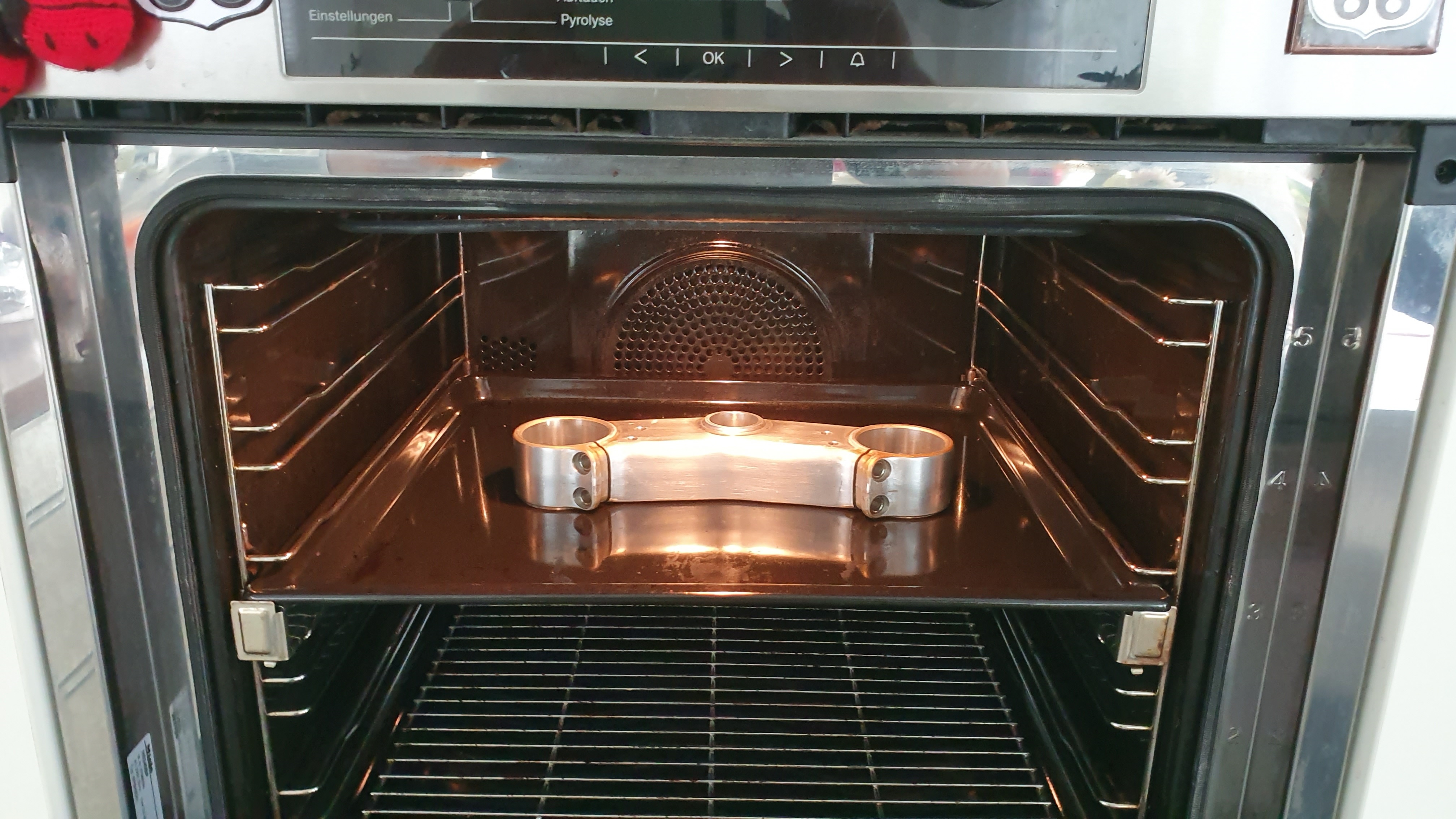 Jetzt fehlt nur noch das zusammenfügen....Das Joch misst am Pressitz 31.30mm, die Bohrung der Brücke 31.2mm. Somit ist das Pressmass ist 10/100mm - als 1/10mm "negatives" Spiel. Bei 270 Grad Temperaturunterschied zwischen den Teilen müsste sich laut Theorie ein (positives) Spiel von 9/100mm einstellen. Damit müsste sich das Joch mit genauem Zielen von weitem in die Brücke einwerfen lassen.