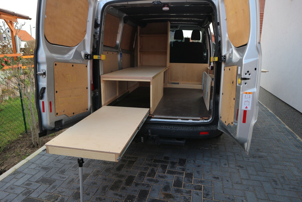 Der Schwerlastauszug hinten trägt bis zu 120kg und ist 1,20m lang. Ich habe dennoch ein Teleskopaluminiumbein als zusätzlichen Stütze montiert, falls sich mal jemand drauf setzt. Es folgen noch Kuststoffschienen auf dem Boden des Auszuges, damit die Kisten eine Führung haben und nicht verrutschen können.