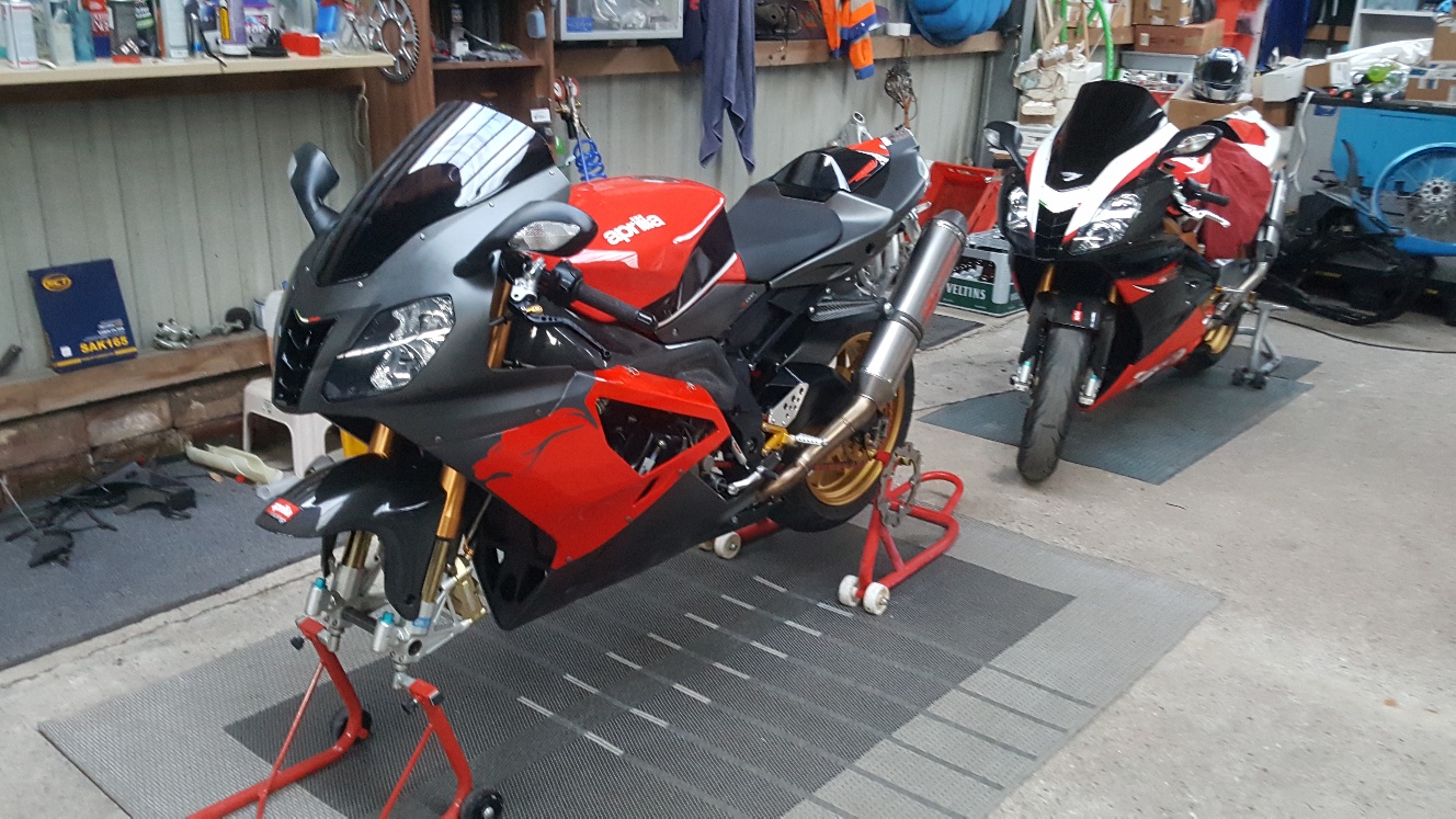 Ostern kam eine 09er Mille Factory für die Sonntagsrunde dazu.Jetzt steht schon wieder eine 04er RSV in leichten Renntrim daneben weil sofort wieder die Lust auf ein paar freie Trainings aufkam nach den ersten Meter auf der Strasse!