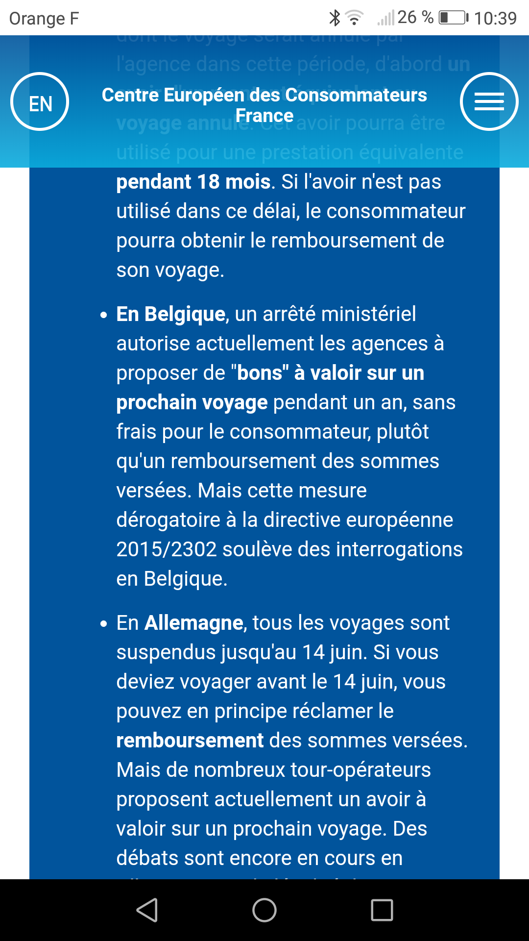 "In Belgien ermächtigt ein Ministerialdekret derzeit die Agenturen, "Gutscheine" anzubieten, die für eine nächste Reise für ein Jahr kostenlos für den Verbraucher verwendet werden können, anstatt die gezahlten Beträge zurückzuerstatten. Diese von der europäischen Richtlinie 2015/2302 abweichende Maßnahme wirft jedoch in Belgien Fragen auf"