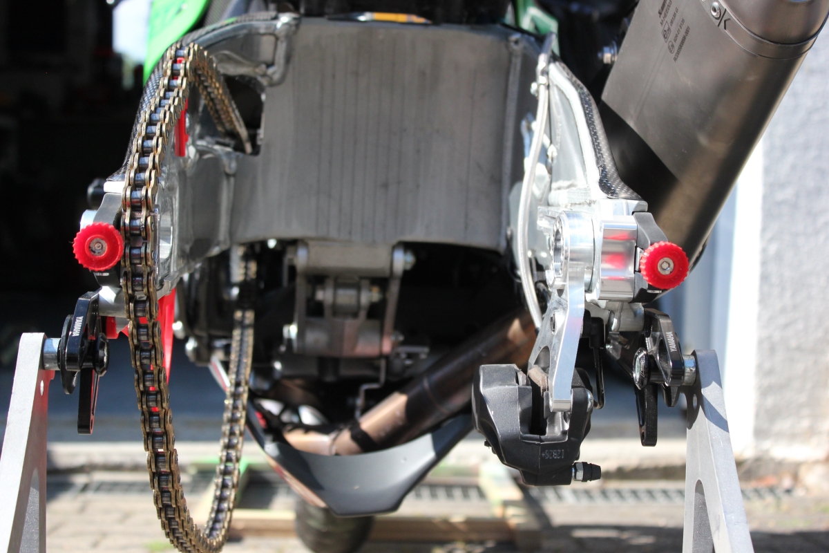 Coole GP-Montageständeraufnahmen von YART habe ich günstig in einem bekannten Kleinanzeigenmarkt günstig erstanden. Das komplette Schnellwechsel-Set habe ich durch eine eigens erdachte Kettenfinne, einen Kettenhalter und ein paar Handräder zur werkzeugfreien Einstellung der Kettenspannung (beides ebenfalls aus meiner Feder) abgerundet.