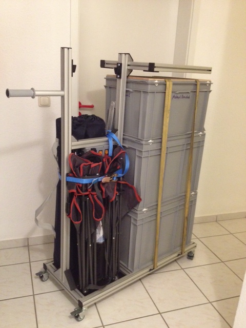 Meine Idee war möglichst alles auf einem Fleck zu haben, möglichst wenig mitnehmen zu müssen (Reifenständer, Wagen für Transportboxen) und so wenig wie möglich hin und herrennen zu müssen. Die Ablage für Laptop bzw. Helm hat mir zudem auch immer gefehlt.