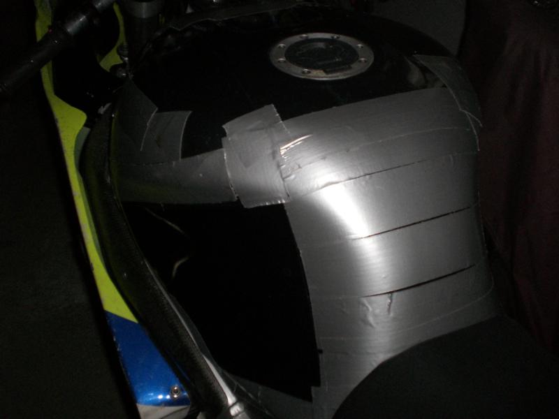 Anschließend wurde noch der Tank beklebt, um Schutz vor Kratzern durch die Tankhaube zu erhalten. Allerdings ist das mit Gaffer-Tape auf die Dauer recht teuer. Also hab ich die vermeintlich kritischen Stellen beklebt und werde mir Tankklebefolie besorgen, mit der ich den rest abdecken werde. Dann noch ne Tube Pattex und das Innenfutter für die tankhaube, dann sollte der Kas gebissen sein. Ach ja, lackieren müßte ich die Tankhaube auch noch...