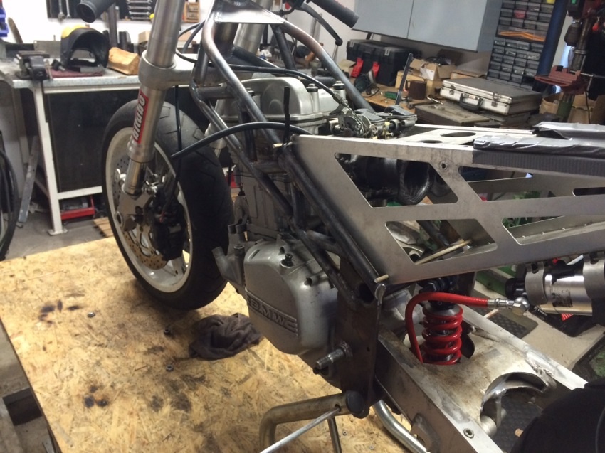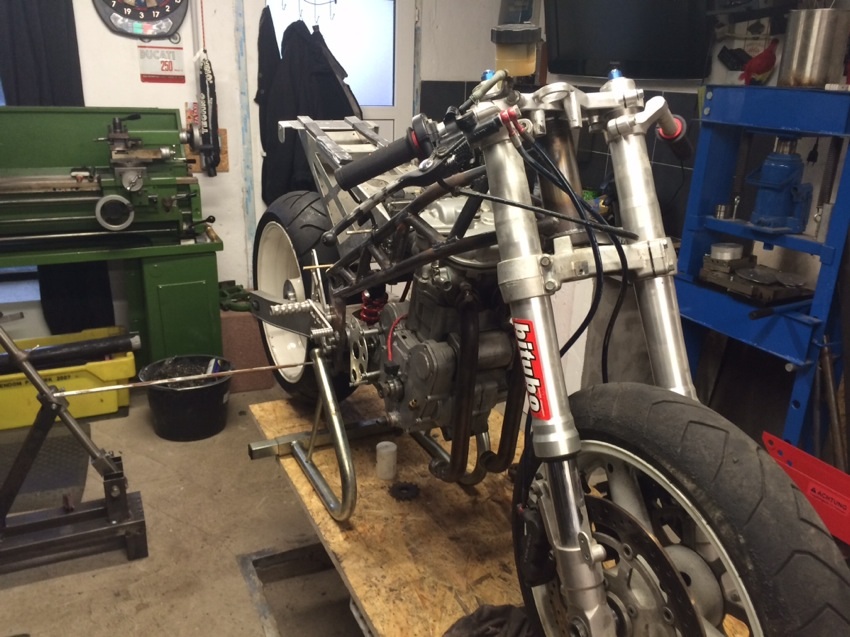 Es fehlen noch die vorderen Motor Halterungen bzw die Halter für den Heckrahmen die werden morgen in Angriff genommen ! Die Gabel passt auch schon